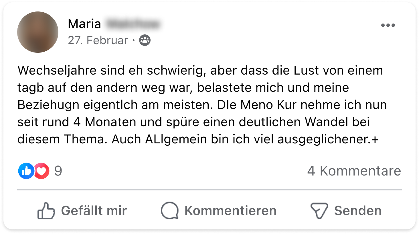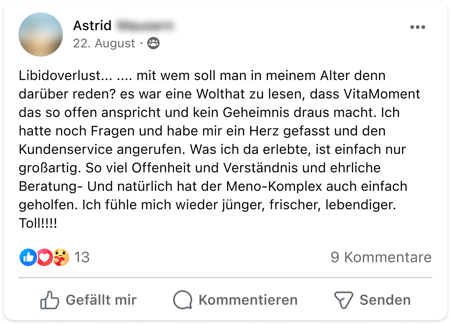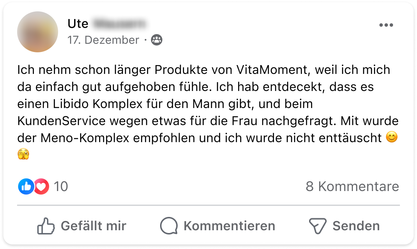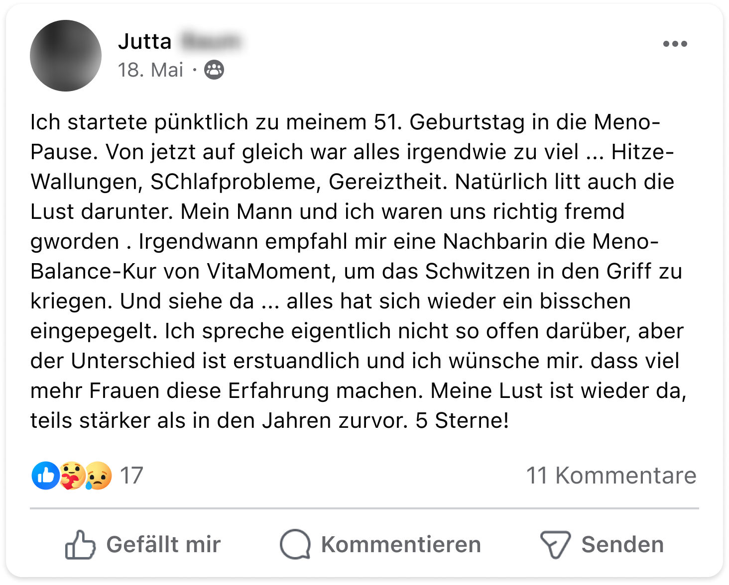 Vor einem Jahr fingen bei mir starke Wechseljahresbeschwerden an – Hitzewallungen, Schlafstörungen und Stimmungsschwankungen. Nach erfolglosen Versuchen mit natürlichen Mitteln stieß ich auf den Meno-Komplex von VitaMoment und probierte ihn aus. Zunächst verschlimmerten sich die Symptome, aber nach anderthalb Wochen ging es mir deutlich besser. Die Hitzewallungen und Schlafprobleme verschwanden, und meine Lebensqualität stieg. Ich kann den Meno-Komplex nur empfehlen!