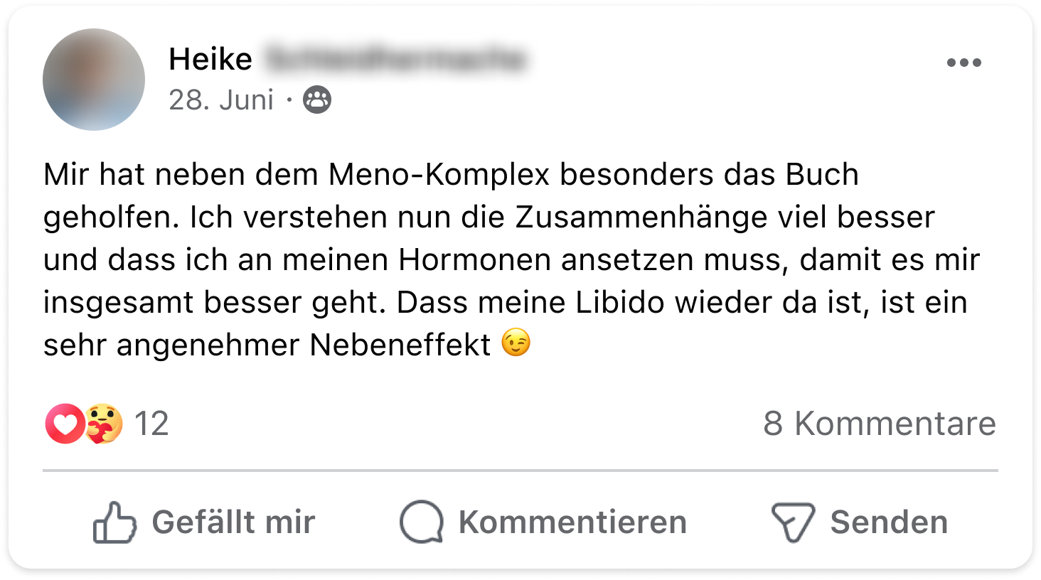 Ich hätte es nicht für möglich gehalten, aber meine Hitzewallungen und Stimmungsschwankungen sind praktisch weg. Ich fühle mich so viel besser! Das Handbuch und das Video-Coaching halfen mir sehr, meine Beschwerden besser zu verstehen. Das kann ich wirklich nur jeder Frau in den Wechseljahren ans Herz legen. 🤩