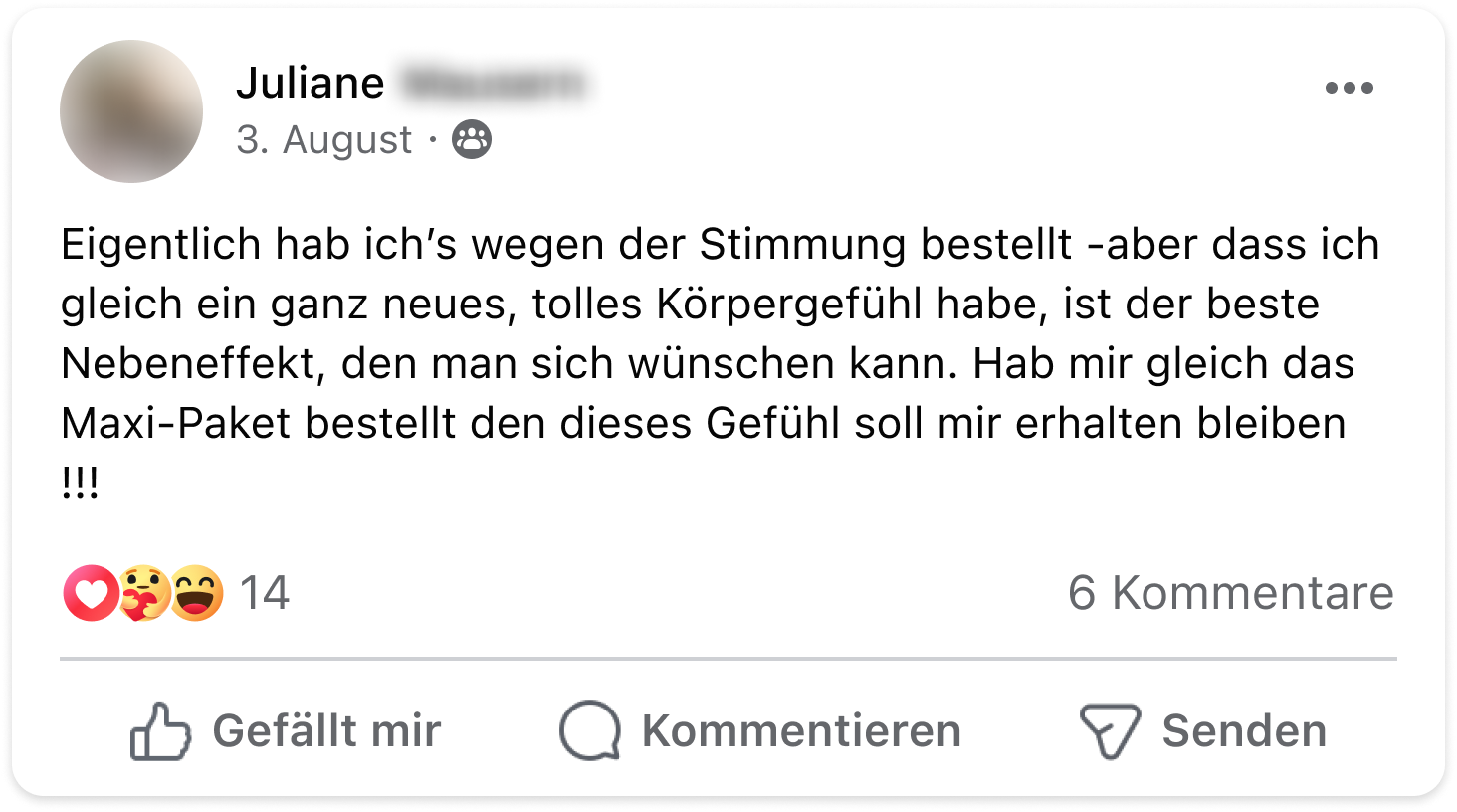 Disclaimer: Dieses Produkt ist nicht zur Diagnose, Behandlung, Heilung von oder zur Vorbeuge vor Krankheiten bestimmt. Die Ergebnisse können variieren / sind eventuell nicht typisch. Bewertungen oder Testimonials sind individuelle Erfahrungsberichte unserer Kunden. Diese Informationen stellen keine medizinische Beratung dar und dürfen auch nicht als eine solche verstanden werden. Sprich bitte mit deinem Arzt, bevor du dein regelmäßiges, ärztlich vorgeschriebenes Behandlungsverfahren änderst. Nahrungsergänzungsmittel sind kein Ersatz für eine ausgewogene und abwechslungsreiche Ernährung und eine gesunde Lebensweise. Das Bildmaterial unserer Kundenfeedbacks wurde aus Gründen des Persönlichkeitsrechts z.T. lizensiert erworben und entspricht nicht immer dem echten Erscheinungsbild.