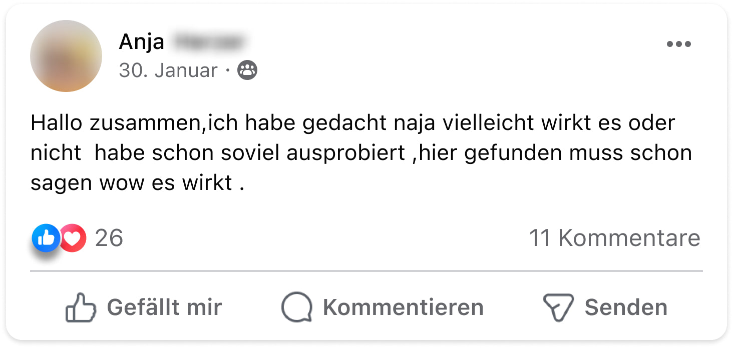 Nach kurzer Zeit der Einnahme ging es mir immer besser. Meine Schmerzen in den Gelenken, besonders im Knie sind verschwunden. Ich kann mich leichter bewegen, bücken und aufstehen. Außerdem haben sich meine Reizdarmprobleme um ein Vielfaches verbessert. Ich habe viel weniger Schmerzen und kann einige Lebensmittel verzehren, die ich vorher nicht essen konnte. Ich werde dranbleiben!