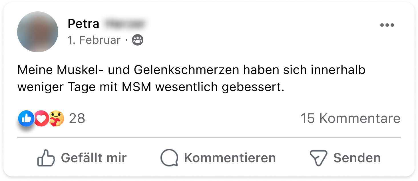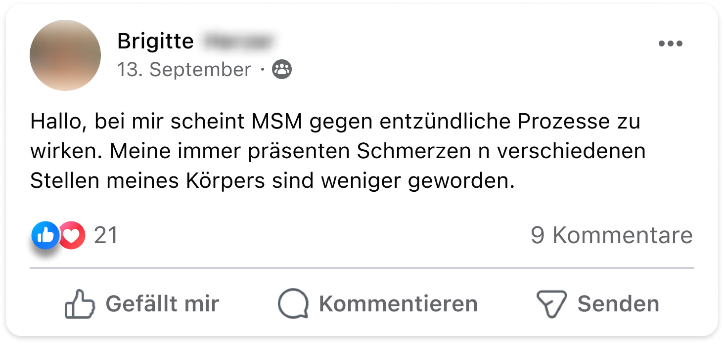 Meine Beschwerden sind in der kurzen Zeit in der ich MSM nehme besser geworden, aber leider noch nicht ganz weg.