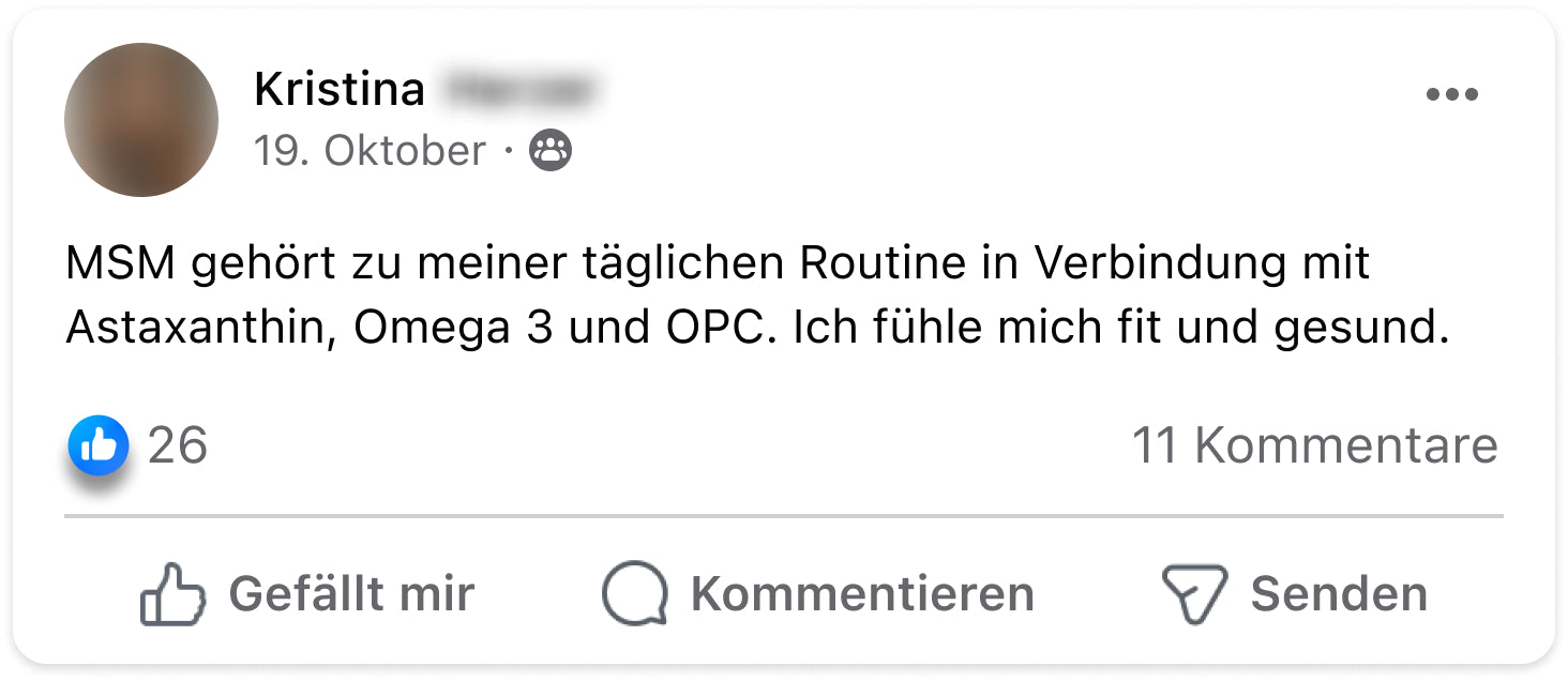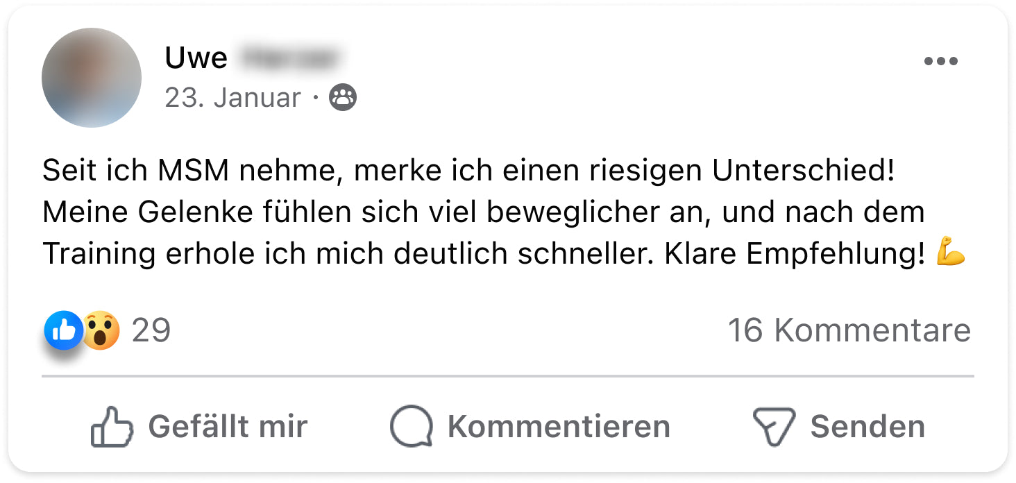 Ich war lange auf der Suche nach einer natürlichen Unterstützung für meine Gelenke, da ich besonders nach dem Sport oft mit Steifheit und Beschwerden zu kämpfen hatte. Nach einigem Recherchieren bin ich auf MSM gestoßen – und ich muss sagen: Es hat mein Leben verändert! Schon nach wenigen Wochen habe ich gemerkt, dass meine Gelenke sich viel geschmeidiger anfühlen und ich mich morgens nicht mehr so steif bewege. Selbst nach intensiven Trainingseinheiten regeneriere ich schneller und habe deutlich weniger Muskelkater.