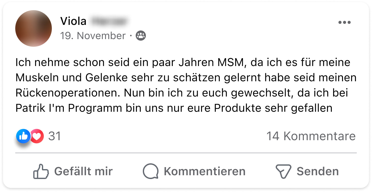 Ich nehme schon seid ein paar Jahren MSM, da ich es für meine Muskeln und Gelenke sehr zu schätzen gelernt habe seid meinen Rückenoperationen. Nun bin ich zu euch gewechselt, da ic...h bei Patrik I'm Programm bin uns nur eure Produkte sehr gefallen.