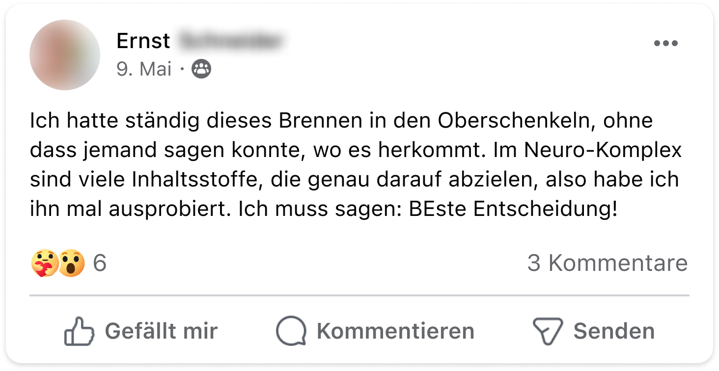 Ich nehme täglich 2mal 1Kapsel Neuro-Komplex ein und merke,dass es mir gut tut. Das brennen im Körper ist um die Hälfte weniger geworden und habe dadurch meine Lebensqualität zurüc...k bekommen. Ich werde es mir wieder bestellen und kann es wirklich empfehlen.