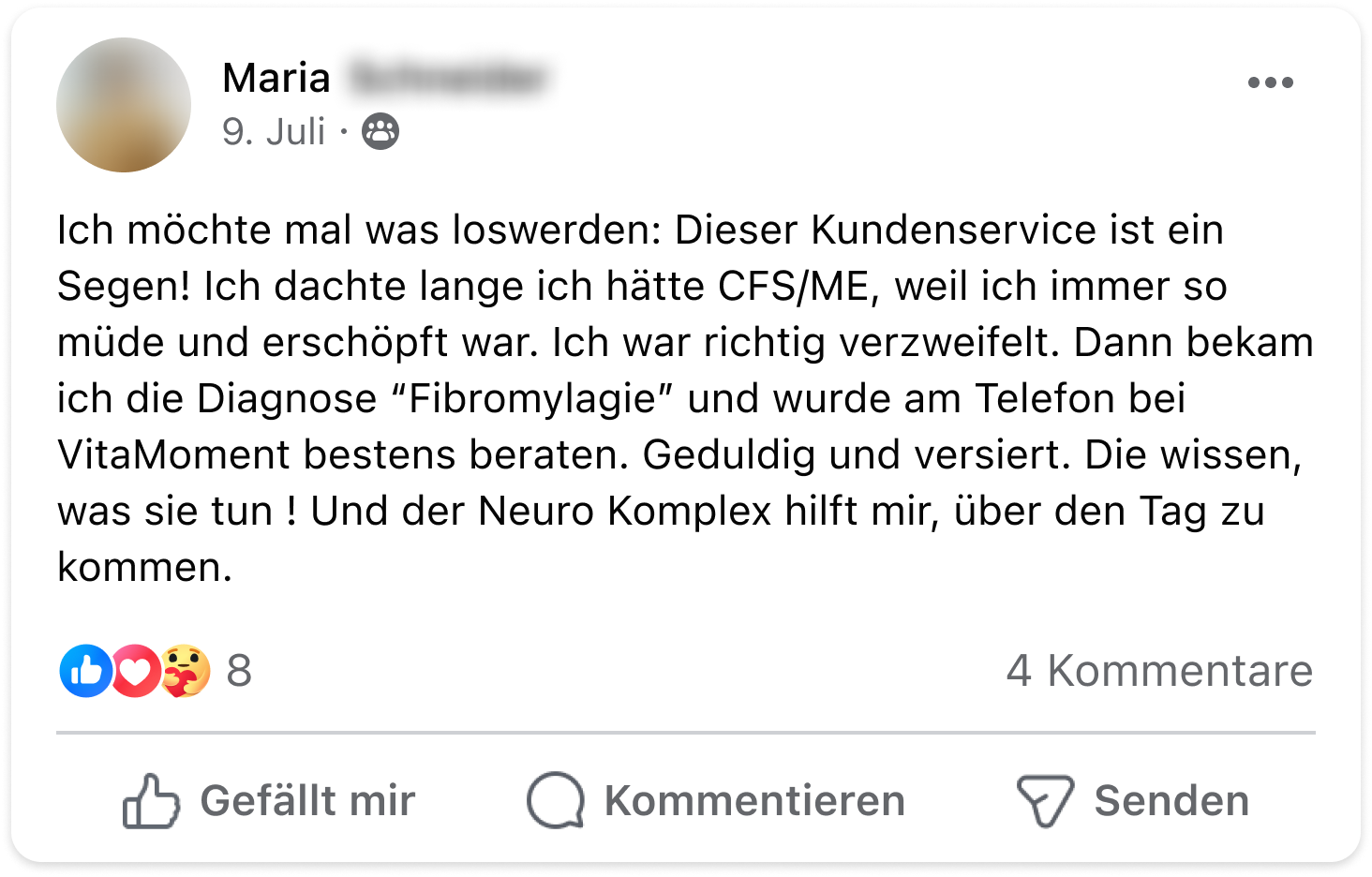 Dauererschöpfung war mein neuer Lebenszustand. Und es war grässlich. Ich war bereit, alles zu tun und stieß durch meine Partnerin auf VitaMoment. Der Neuro-Komplex schien nach mir zu rufen. Jetzt, nach 6 Wochen Einnahme, spüre ich wieder den Unterschied zwischen „müde“ und „wirklich fertig“. Das klingt banal, aber es bedeutet für mich Lebensqualität.