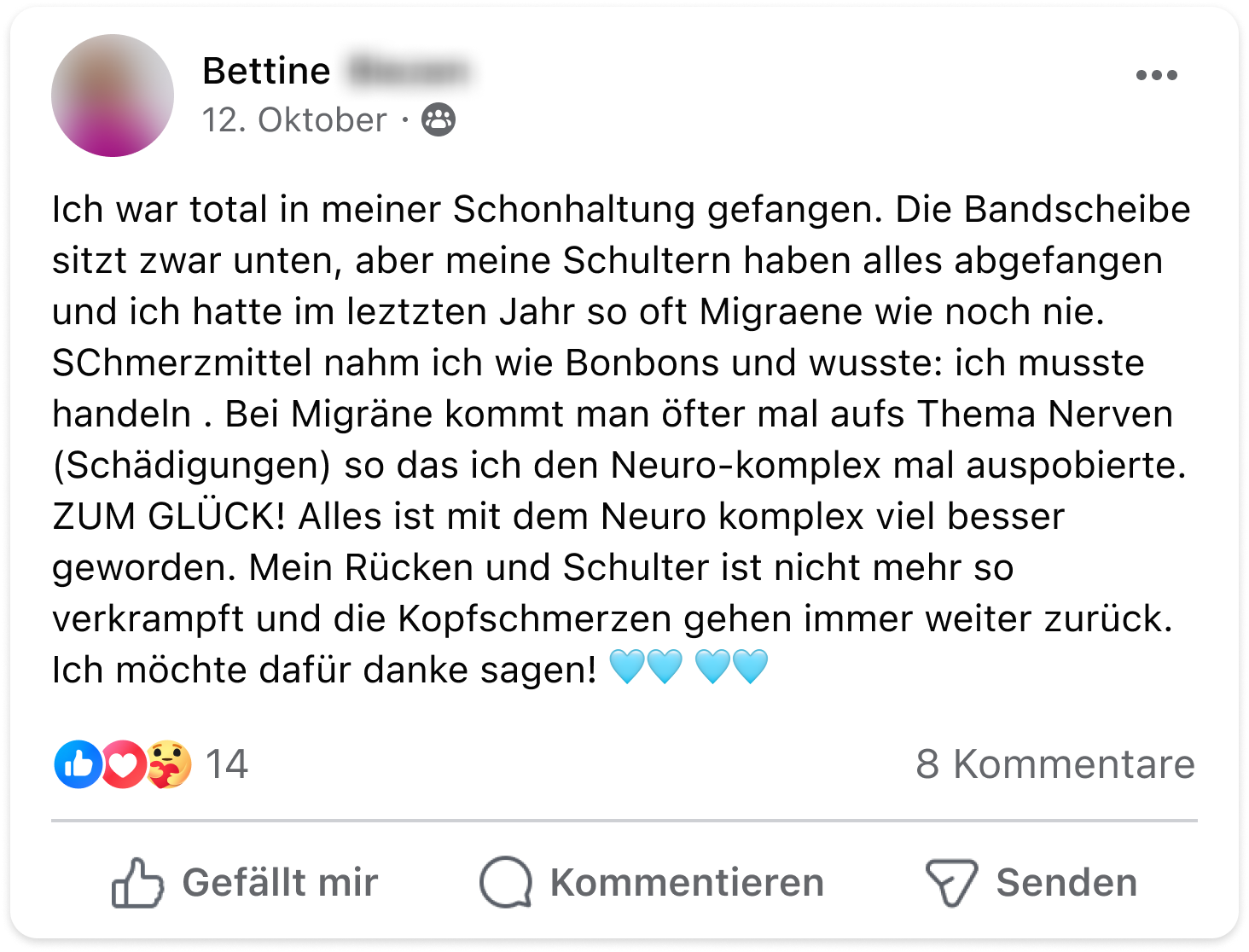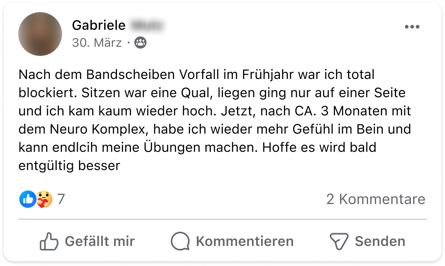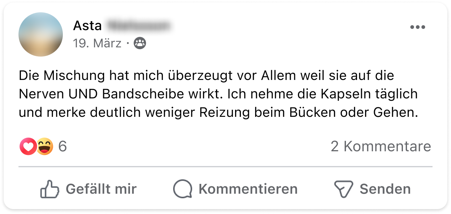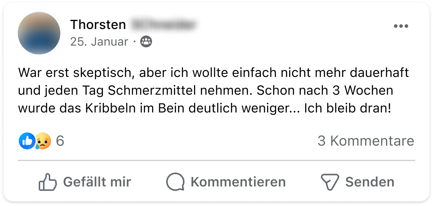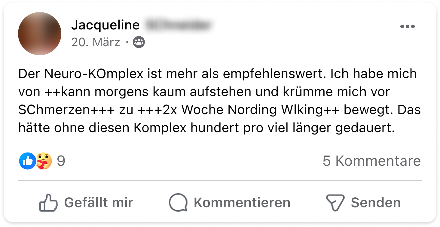 Ich musste in den letzten Jahren starke Schmerzmittel nehmen, die aber immer nur ein paar Stunden halfen. Mit dem Neuro-Komplex sind meine Schmerzen nun langfristig abgeschwächt und ich kann die Schmerztabletten immer öfter niedriger dosieren.