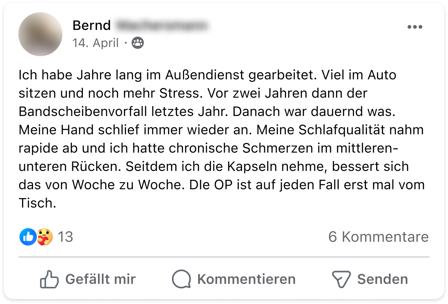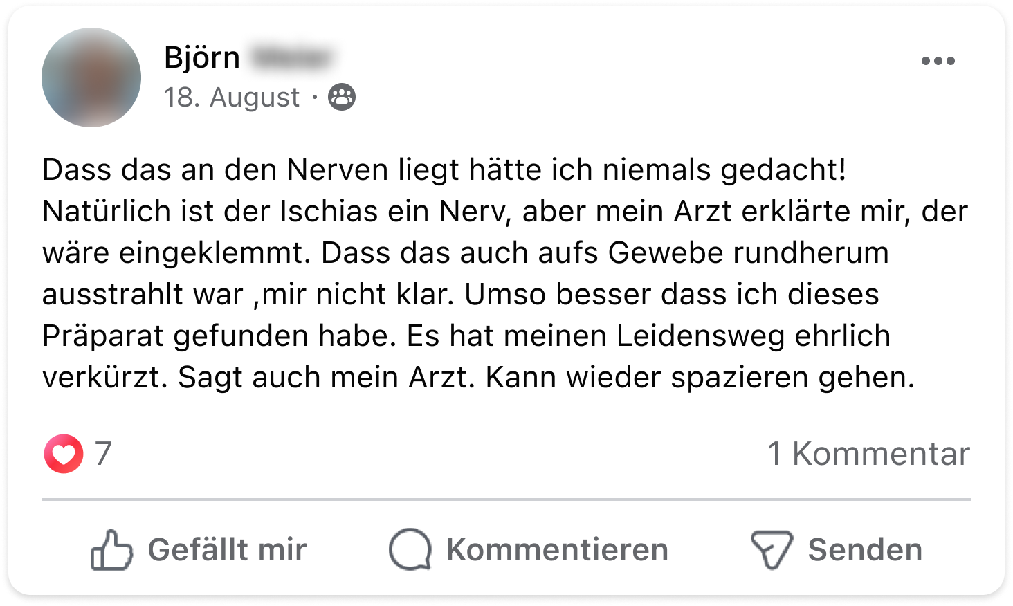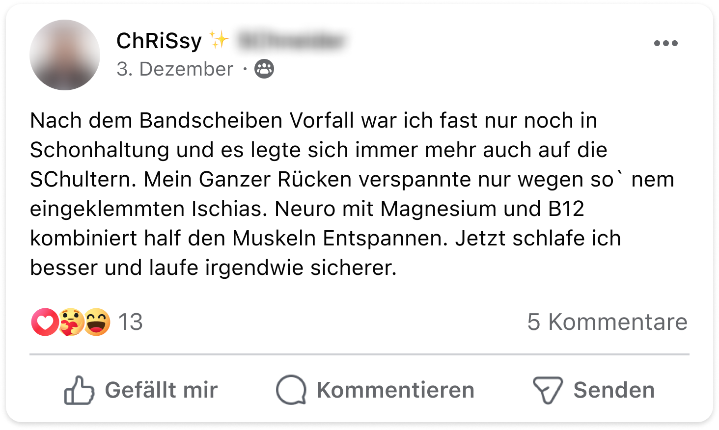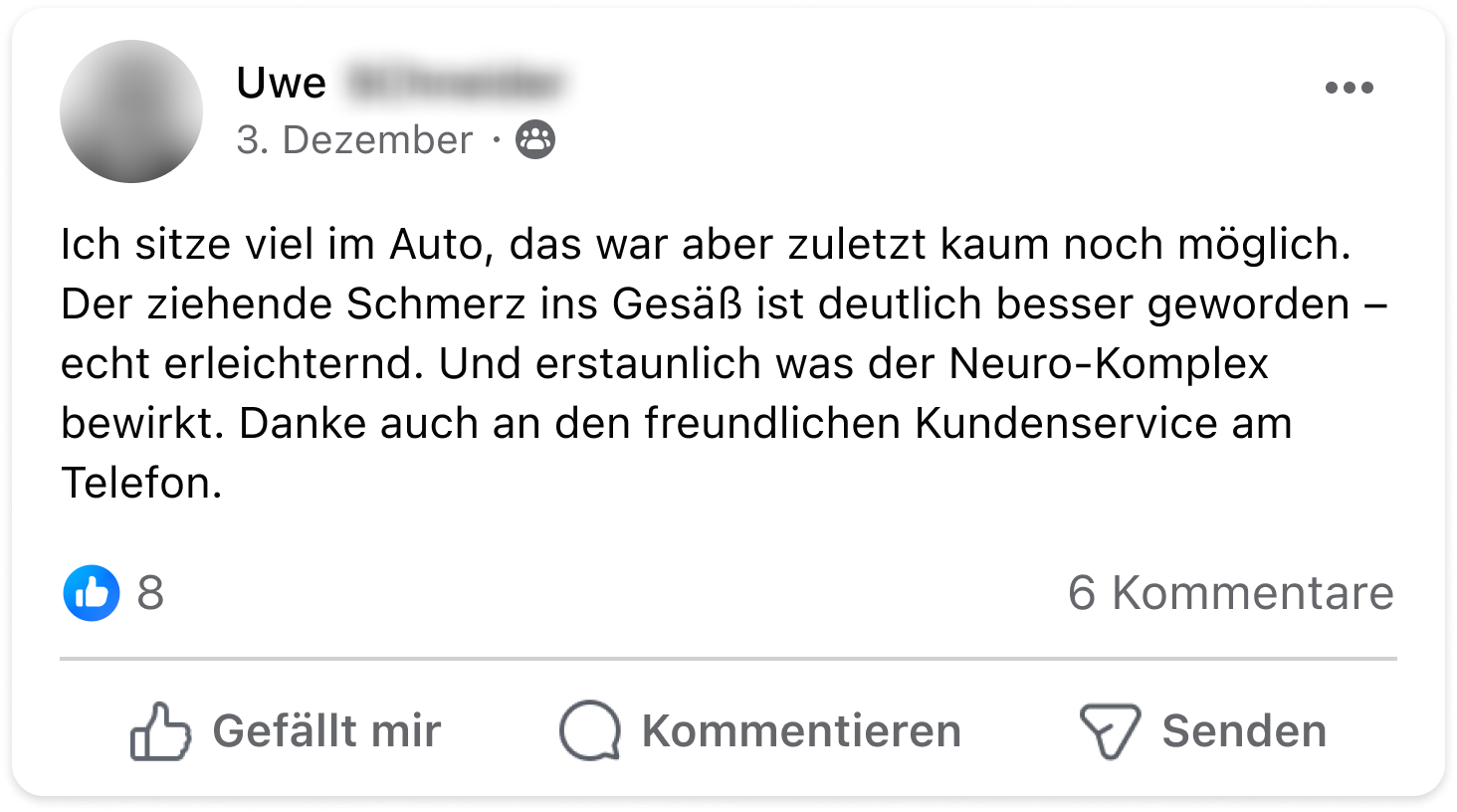 Ich musste in den letzten Jahren starke Schmerzmittel nehmen, die aber immer nur ein paar Stunden halfen. Mit dem Neuro-Komplex sind meine Schmerzen nun langfristig abgeschwächt und ich kann die Schmerztabletten immer öfter niedriger dosieren.