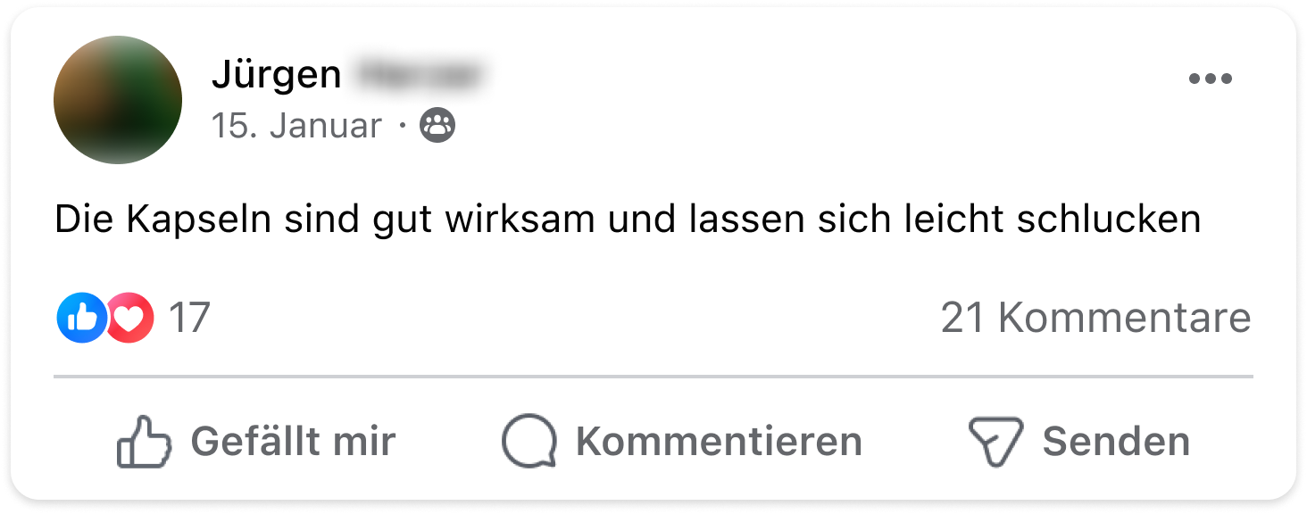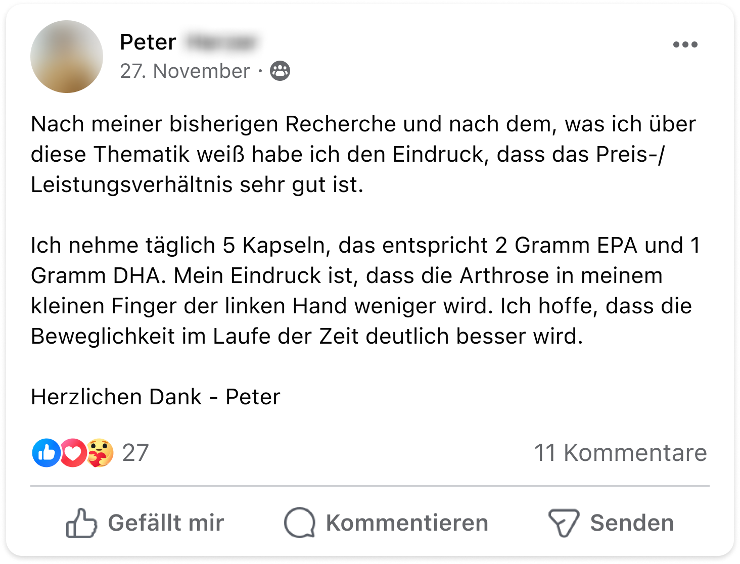 Ich stellte meine Ernährung um und begann, die Omega-3-Kapseln von Vita Moment zu nehmen – zunächst skeptisch, doch heute weiß ich, dass es die richtige Entscheidung war. Mir geht es deutlich besser, ich konnte bereits einige Medikamente absetzen und bin wieder schmerzfrei spazieren. Meine Entzündungen sind rückläufig, und auch meine Familie sieht, wie sehr ich mich verändert habe.
