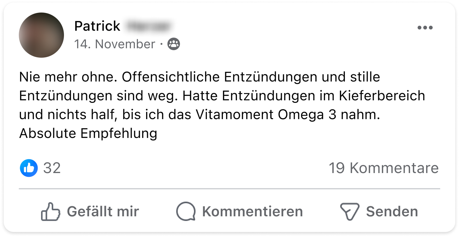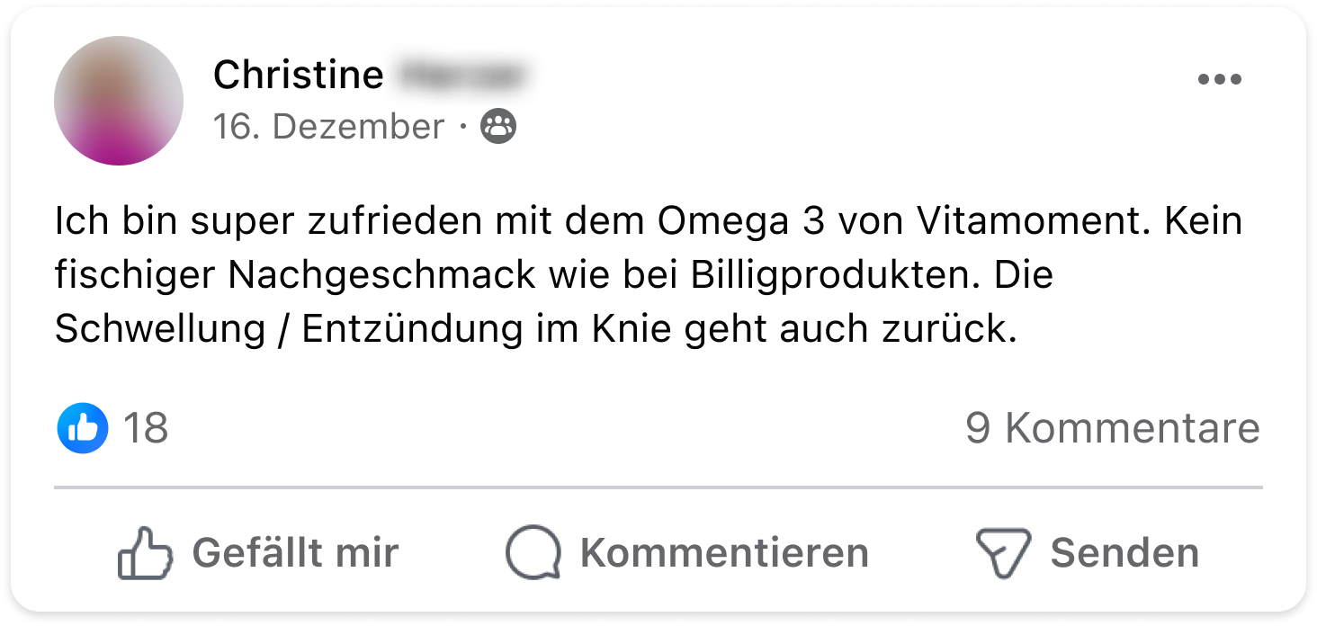 Das Omega3 Produkt von Vitamoment ist großartig. Ich möchte nicht mehr darauf verzichten. Ich habe spürbar weniger Entzündungen im Körper. Me...iner Schulter geht es wieder komplett gut und mein Knie verbessert sich zunehmend. Ganz toll ist auch, dass bei eurem Produkt nicht dieser fischige Nachgeschmack auftaucht...wie evtl bei anderen Unternehmen, die Omega3 herstellen. Großes Plus bei euch zu bestellen. Ich empfehle euch auch stetig an Freunde weiter. Bleibt bei dieser Qualität bitte.