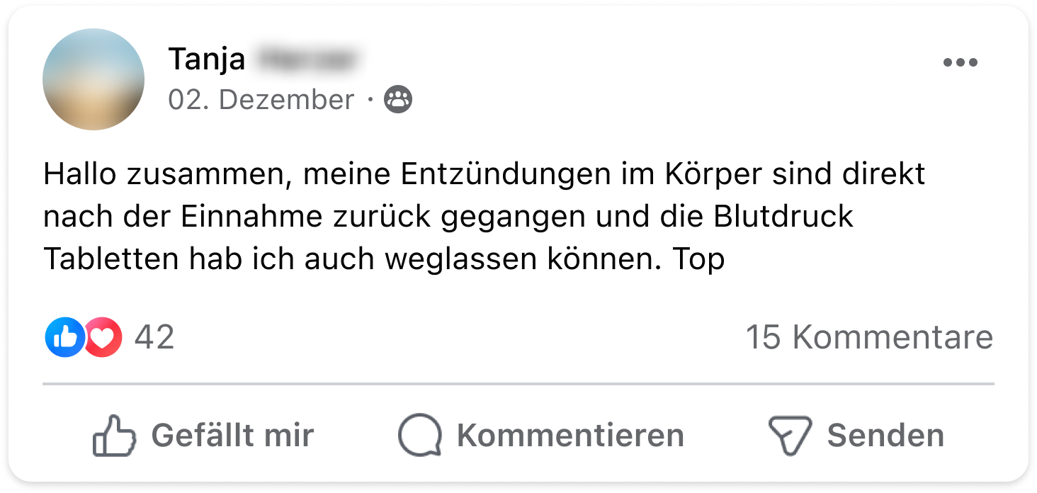 Mein Blutbefund ist bis auf 1 Wertin Ordnung ! Mein Mann hat seine Blutdrucktabletten weggelassen wir wollten sehn was passiert und siehe da über 1 Monat keinen erhöhten Blutdruck ...mehr! Er ist auch nicht mehr so müde und die Gelenkschmerzen in den Knien ist auch deutlich besser geworden! Danke❤