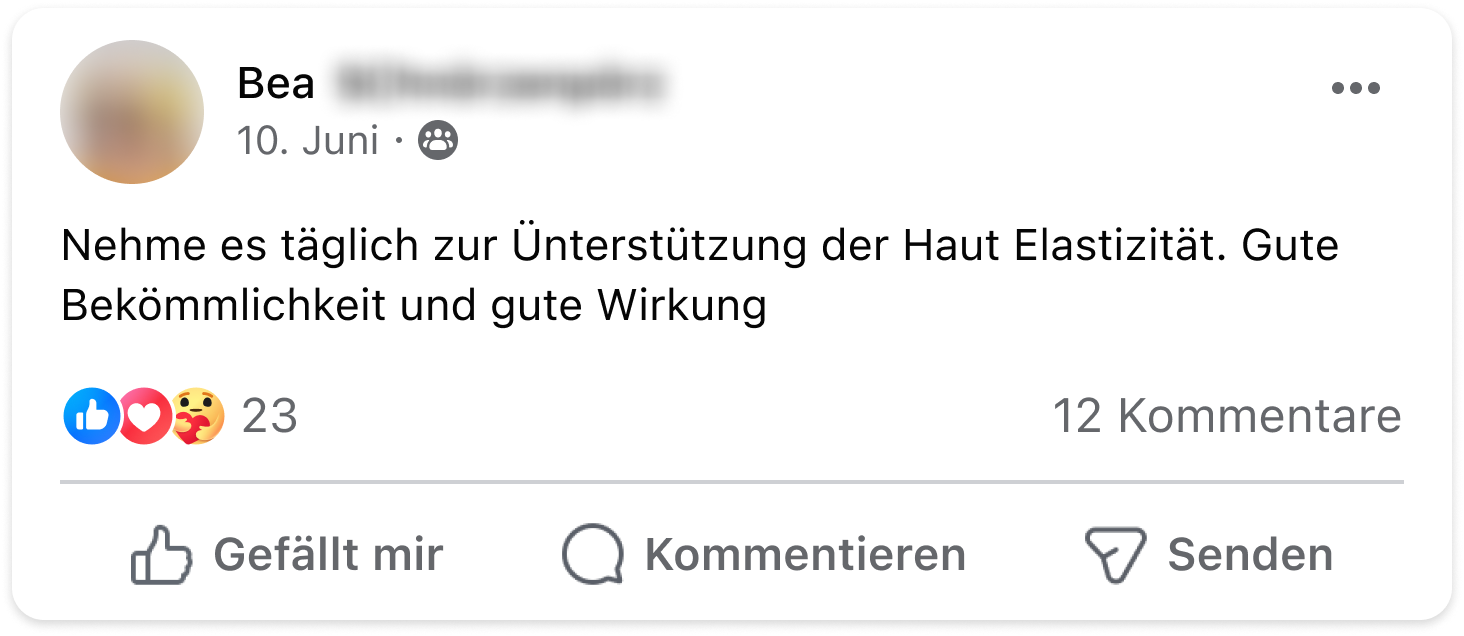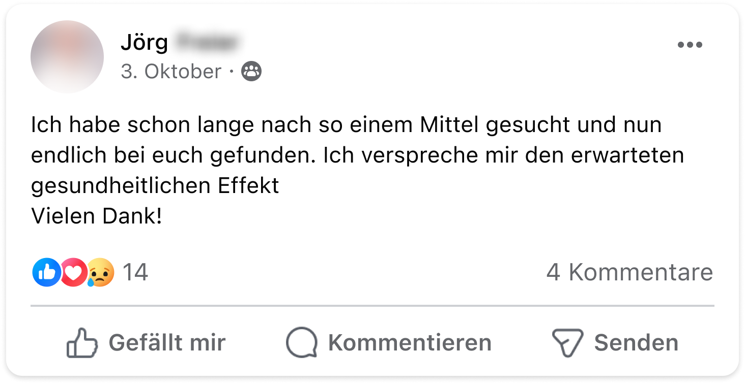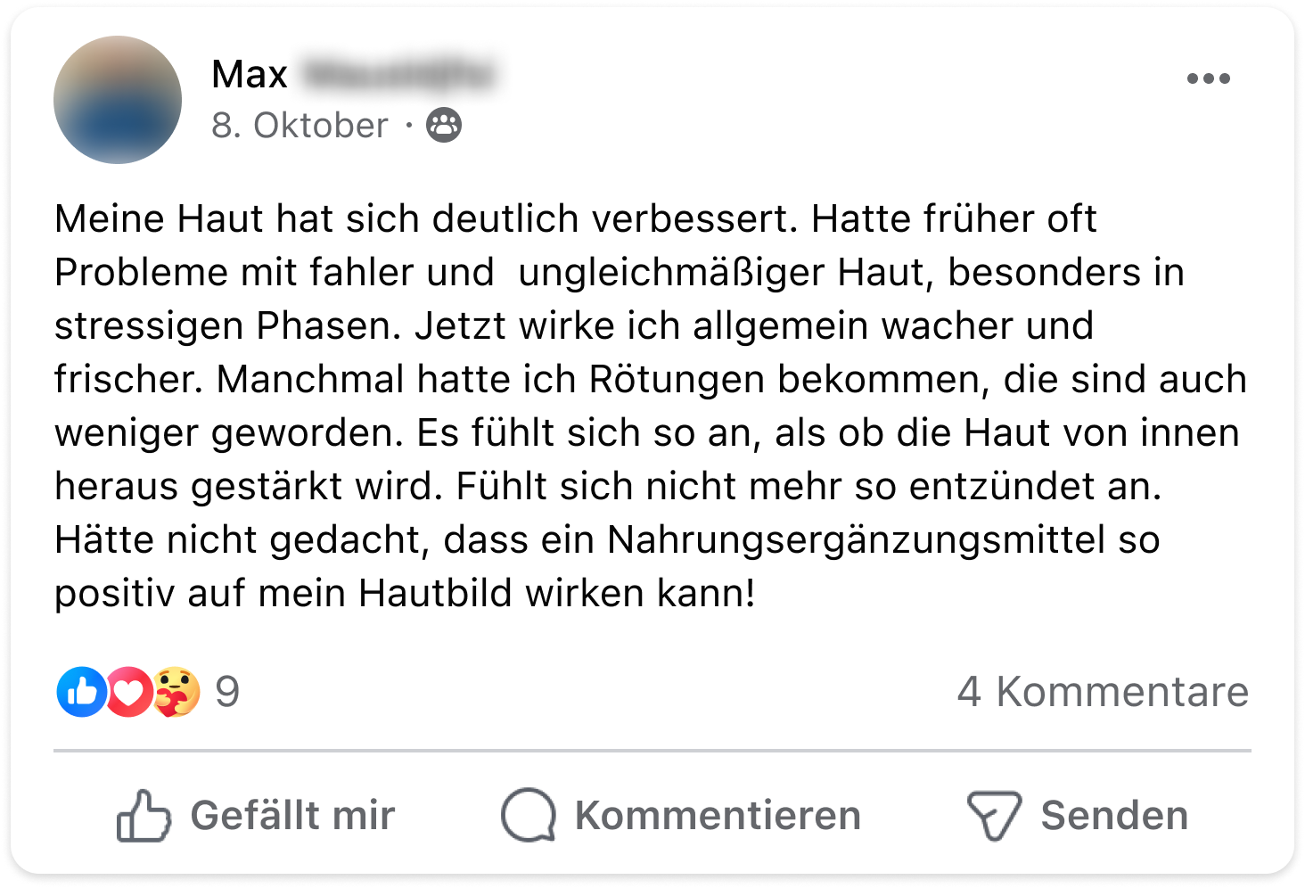 Disclaimer: Dieses Produkt ist nicht zur Diagnose, Behandlung, Heilung von oder zur Vorbeuge vor Krankheiten bestimmt. Die Ergebnisse können variieren / sind eventuell nicht typisch. Bewertungen oder Testimonials sind individuelle Erfahrungsberichte unserer Kunden. Diese Informationen stellen keine medizinische Beratung dar und dürfen auch nicht als eine solche verstanden werden. Sprich bitte mit deinem Arzt, bevor du dein regelmäßiges, ärztlich vorgeschriebenes Behandlungsverfahren änderst. Nahrungsergänzungsmittel sind kein Ersatz für eine ausgewogene und abwechslungsreiche Ernährung und eine gesunde Lebensweise. Das Bildmaterial unserer Kundenfeedbacks wurde aus Gründen des Persönlichkeitsrechts z.T. lizensiert erworben und entspricht nicht immer dem echten Erscheinungsbild.