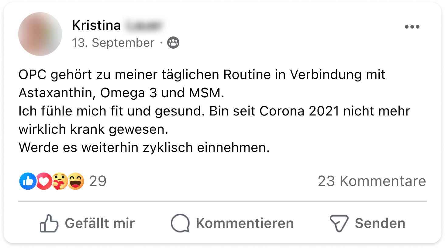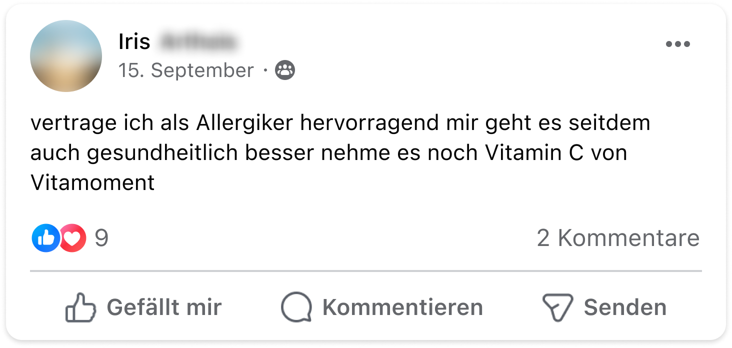 Ich benutze das OPC von Vitamoment schon seit langer Zeit, und es tut meiner Haut unglaublich gut. Früher hatte ich oft mit Hautproblemen wie Sonnenallergie zu kämpfen, aber seit ich OPC nehme, gehört das der Vergangenheit an. Meine Haut ist viel widerstandsfähiger geworden, und ich kann den Sommer jetzt viel mehr genießen, ohne mich ständig um Hautreaktionen sorgen zu müssen.