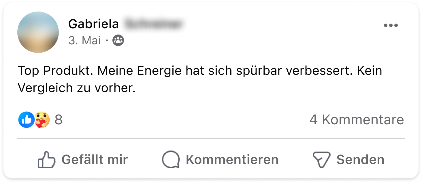Disclaimer: Dieses Produkt ist nicht zur Diagnose, Behandlung, Heilung von oder zur Vorbeuge vor Krankheiten bestimmt. Die Ergebnisse können variieren / sind eventuell nicht typisch. Bewertungen oder Testimonials sind individuelle Erfahrungsberichte unserer Kunden. Diese Informationen stellen keine medizinische Beratung dar und dürfen auch nicht als eine solche verstanden werden. Sprich bitte mit deinem Arzt, bevor du dein regelmäßiges, ärztlich vorgeschriebenes Behandlungsverfahren änderst. Nahrungsergänzungsmittel sind kein Ersatz für eine ausgewogene und abwechslungsreiche Ernährung und eine gesunde Lebensweise. Das Bildmaterial unserer Kundenfeedbacks wurde aus Gründen des Persönlichkeitsrechts z.T. lizensiert erworben und entspricht nicht immer dem echten Erscheinungsbild.