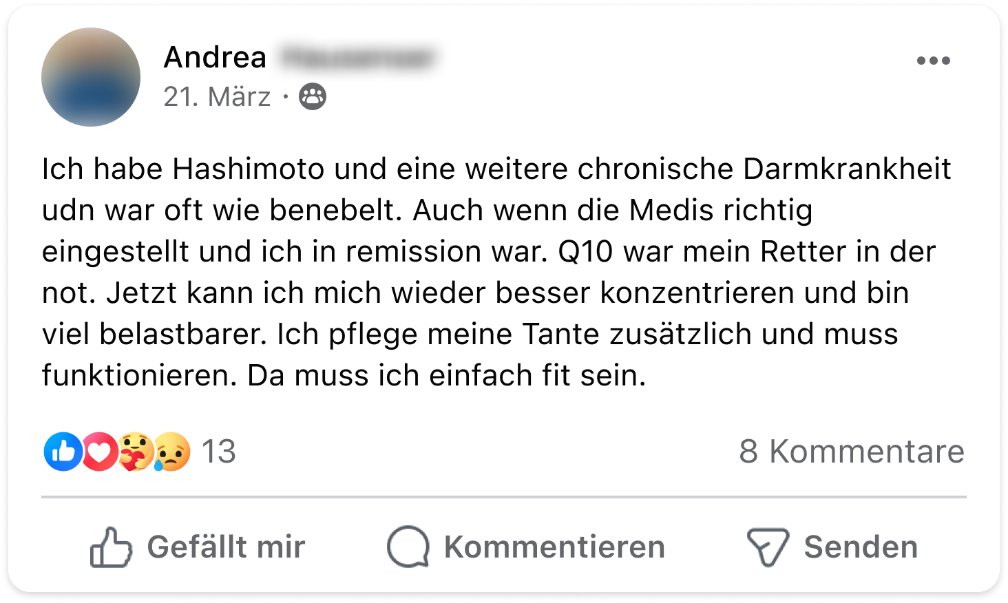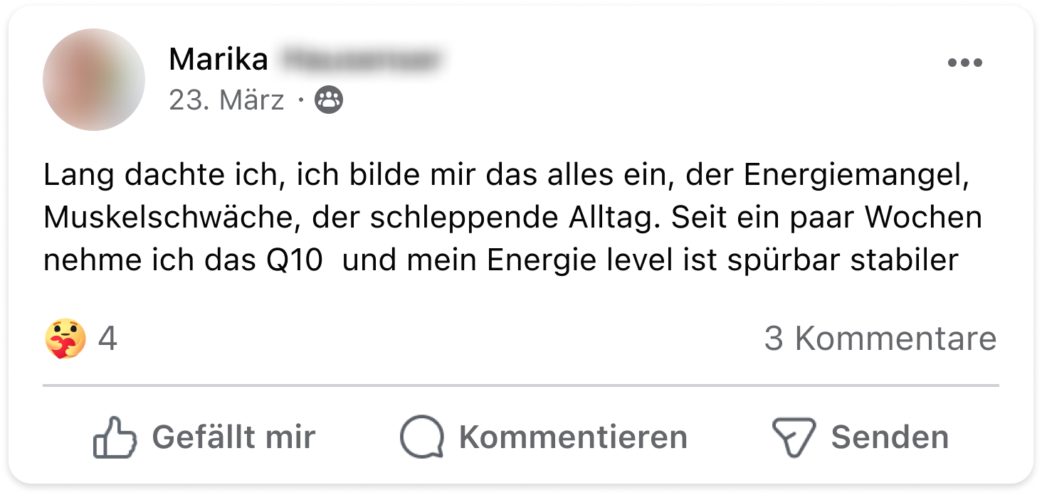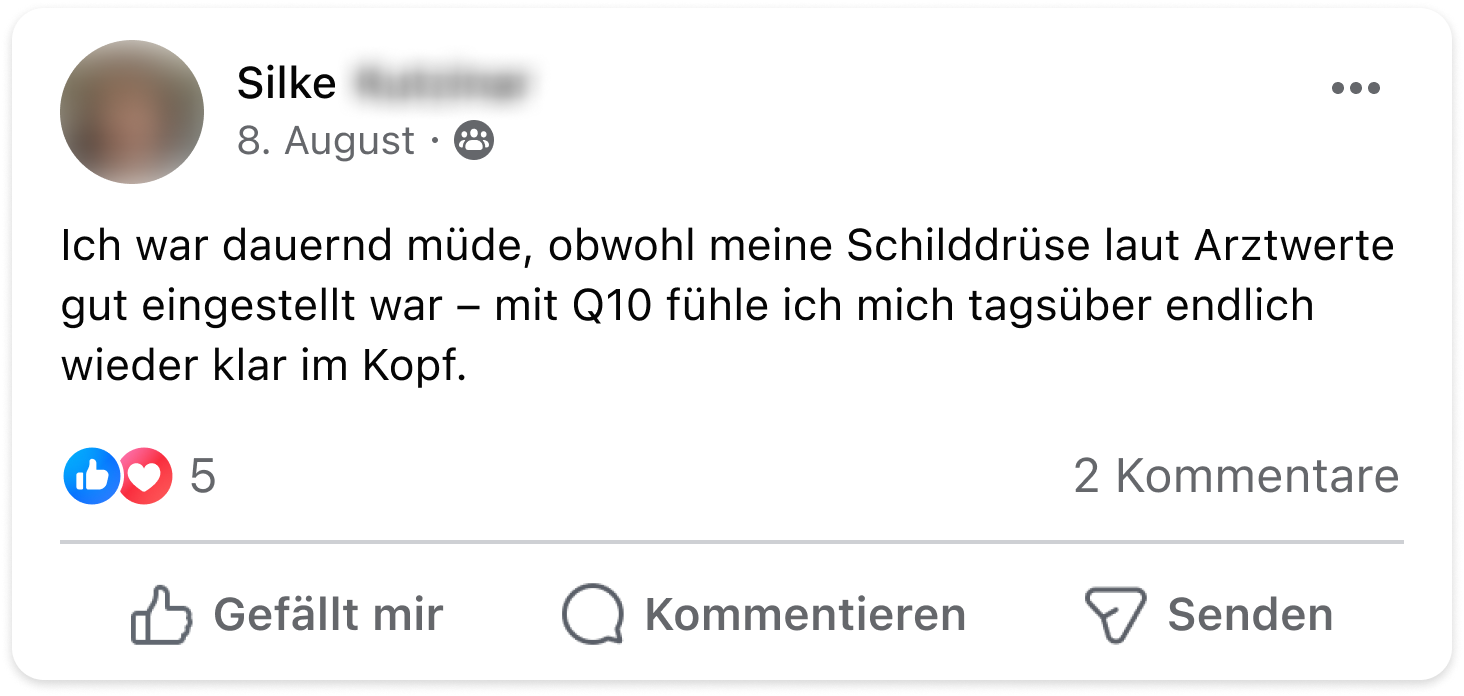 Ich habe Schilddrüsenunterfunktion und war wochenlang nur noch gereizt, ständig erschöpft und mein Schlaf war eine Katastrophe. Mein Apotheker empfahl mir, Antioxidantien zu probieren. Als VitaMoment-Kundin habe ich zuerst dort geschaut und das Q10 entdeckt. Heute, nach 2 Monaten Einnahme, wache ich bereits erholter auf, bin wieder konzentrierter bei der Arbeit – und bin abends noch ansprechbar für meine Familie.