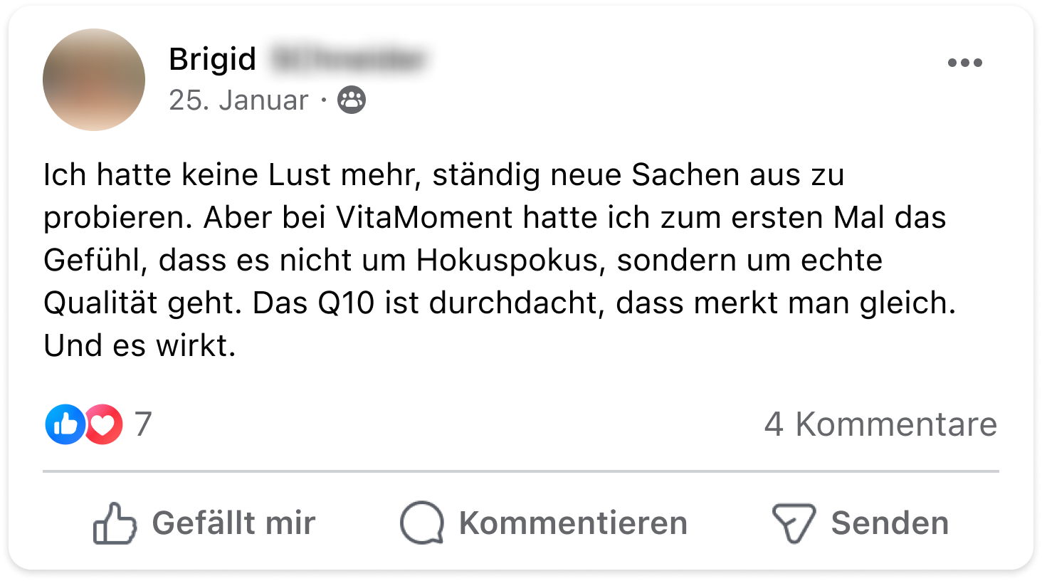 Ich bin 63 und interessiere mich schon immer für Nahrungsergänzungsmittel. Bei VitaMoment blieb ich aus guten Gründen hängen – und besonders am Q10. Meine Muskeln sind viel entspannter und meine Haut sieht viel besser und frischer aus. Das Produkt möchte ich wirklich nicht mehr missen.