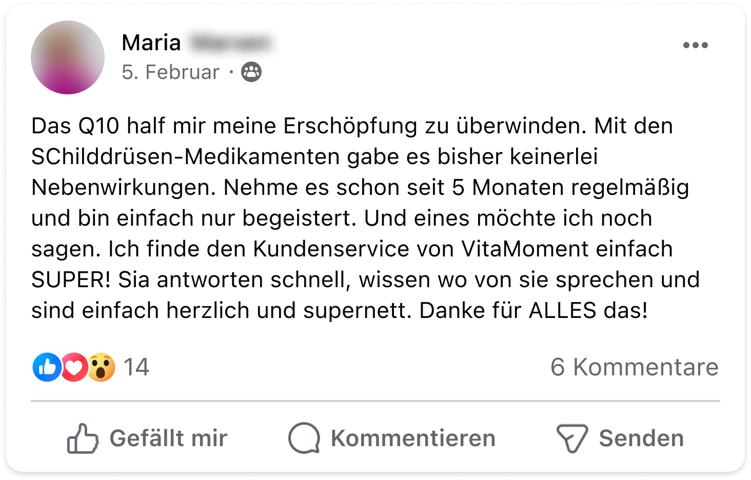 Durch VitaMoment habe ich endlich Nahrungsergänzung gefunden, die nicht nur wirkt, sondern auch super in meinen Alltag passt. Ob für mehr Energie, besseren Schlaf oder ein gutes Bauchgefühl – ich fühle mich rundum wohl. Besonders schätze ich den schnellen Support und die vielen durchdachten Produkte. Danke, dass es euch gibt!