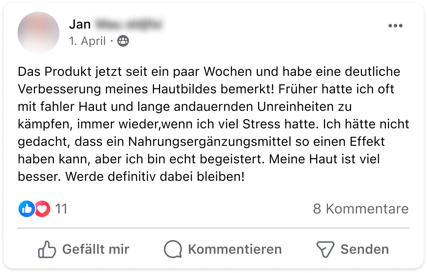 Disclaimer: Dieses Produkt ist nicht zur Diagnose, Behandlung, Heilung von oder zur Vorbeuge vor Krankheiten bestimmt. Die Ergebnisse können variieren / sind eventuell nicht typisch. Bewertungen oder Testimonials sind individuelle Erfahrungsberichte unserer Kunden. Diese Informationen stellen keine medizinische Beratung dar und dürfen auch nicht als eine solche verstanden werden. Sprich bitte mit deinem Arzt, bevor du dein regelmäßiges, ärztlich vorgeschriebenes Behandlungsverfahren änderst. Nahrungsergänzungsmittel sind kein Ersatz für eine ausgewogene und abwechslungsreiche Ernährung und eine gesunde Lebensweise. Das Bildmaterial unserer Kundenfeedbacks wurde aus Gründen des Persönlichkeitsrechts z.T. lizensiert erworben und entspricht nicht immer dem echten Erscheinungsbild.