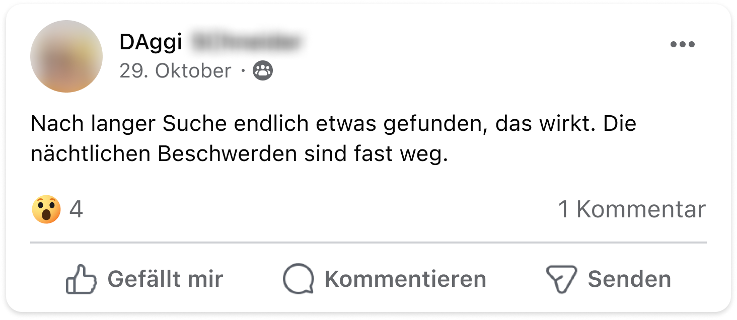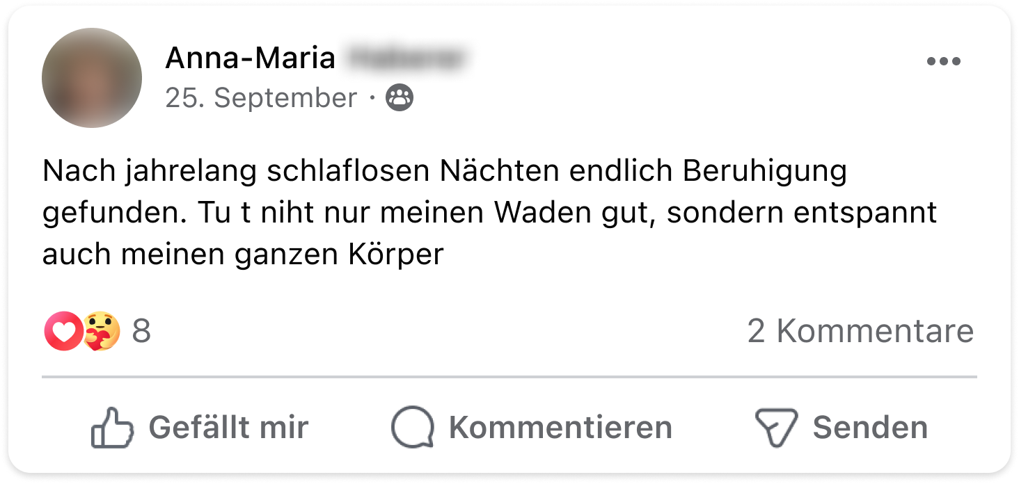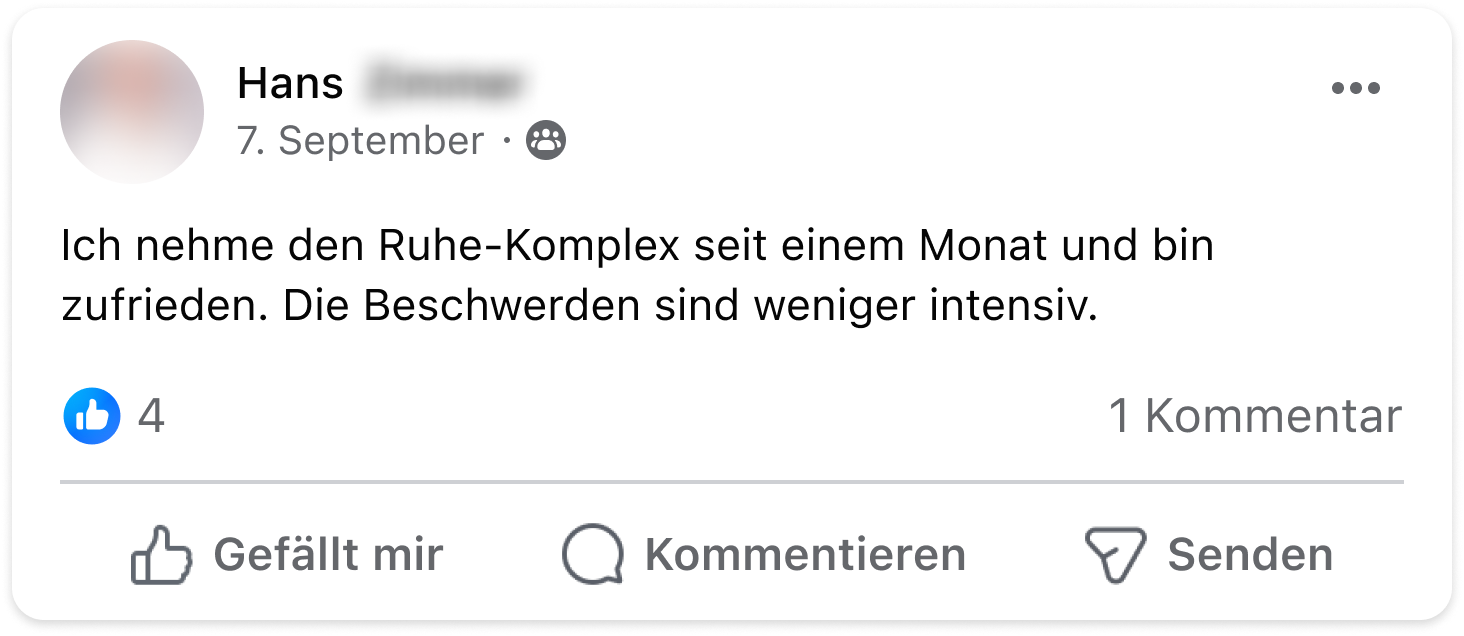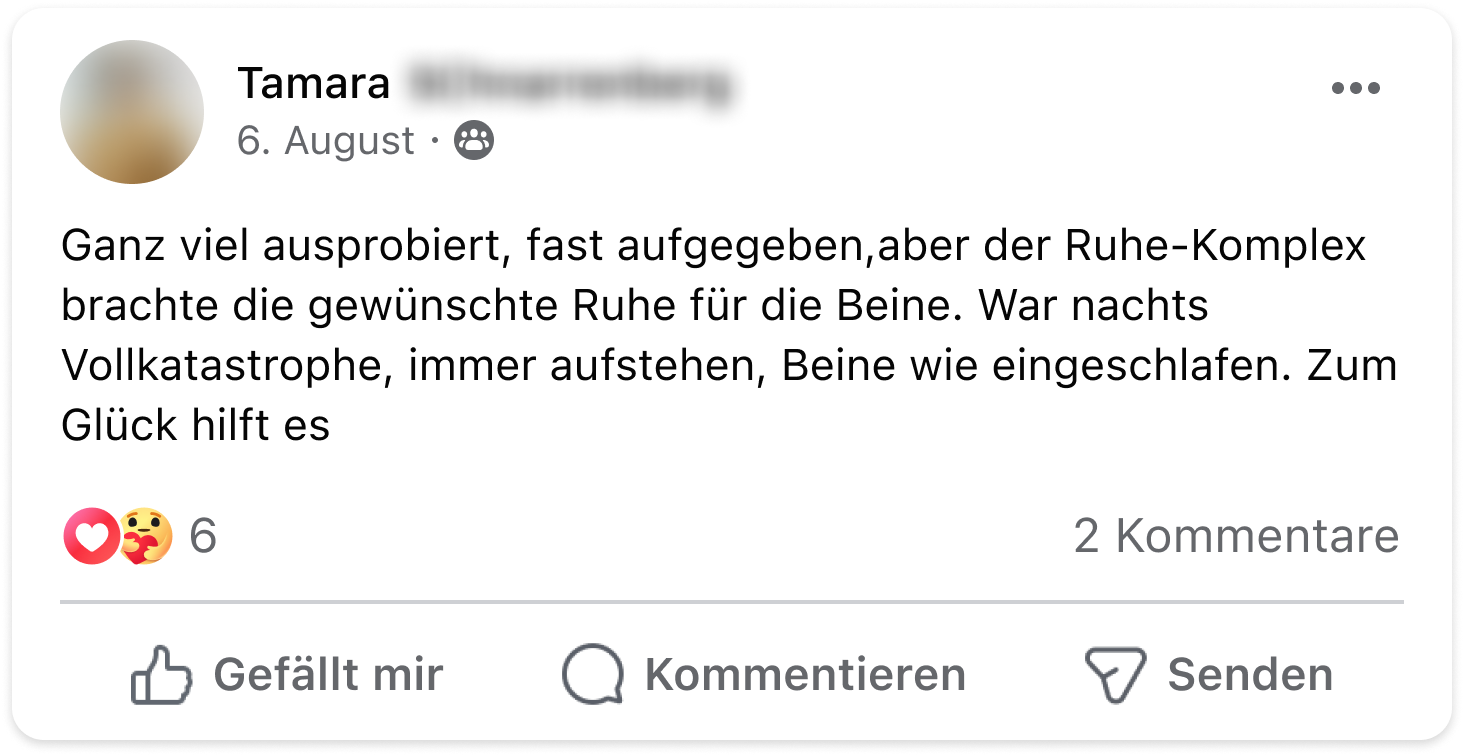 Ich habe seit vielen Jahren unter massivem Restless-Legs-Syndrom gelitten. Jede Nacht wurden meine Beine unruhig – mal links, mal rechts, völlig unvorhersehbar. Das war für mich eine Art Folter und an erholsamen Schlaf war nicht zu denken. Durch Zufall stieß ich auf den Ruhe-Komplex. Schon nach kurzer Zeit merkte ich den Unterschied. Meine Beine wurden ruhig und ich konnte endlich wieder durchschlafen. Seitdem nehme ich den Ruhe-Komplex täglich und meine Beschwerden sind verschwunden – ganz ohne die Risiken der Medikamente. Für mich ist das eine echte Befreiung
