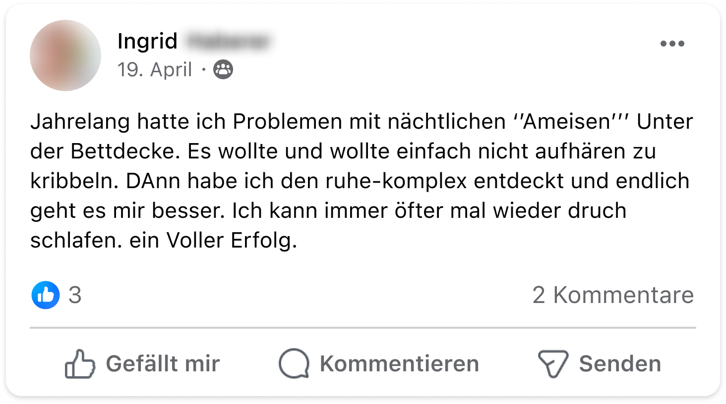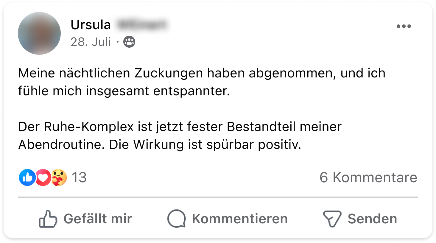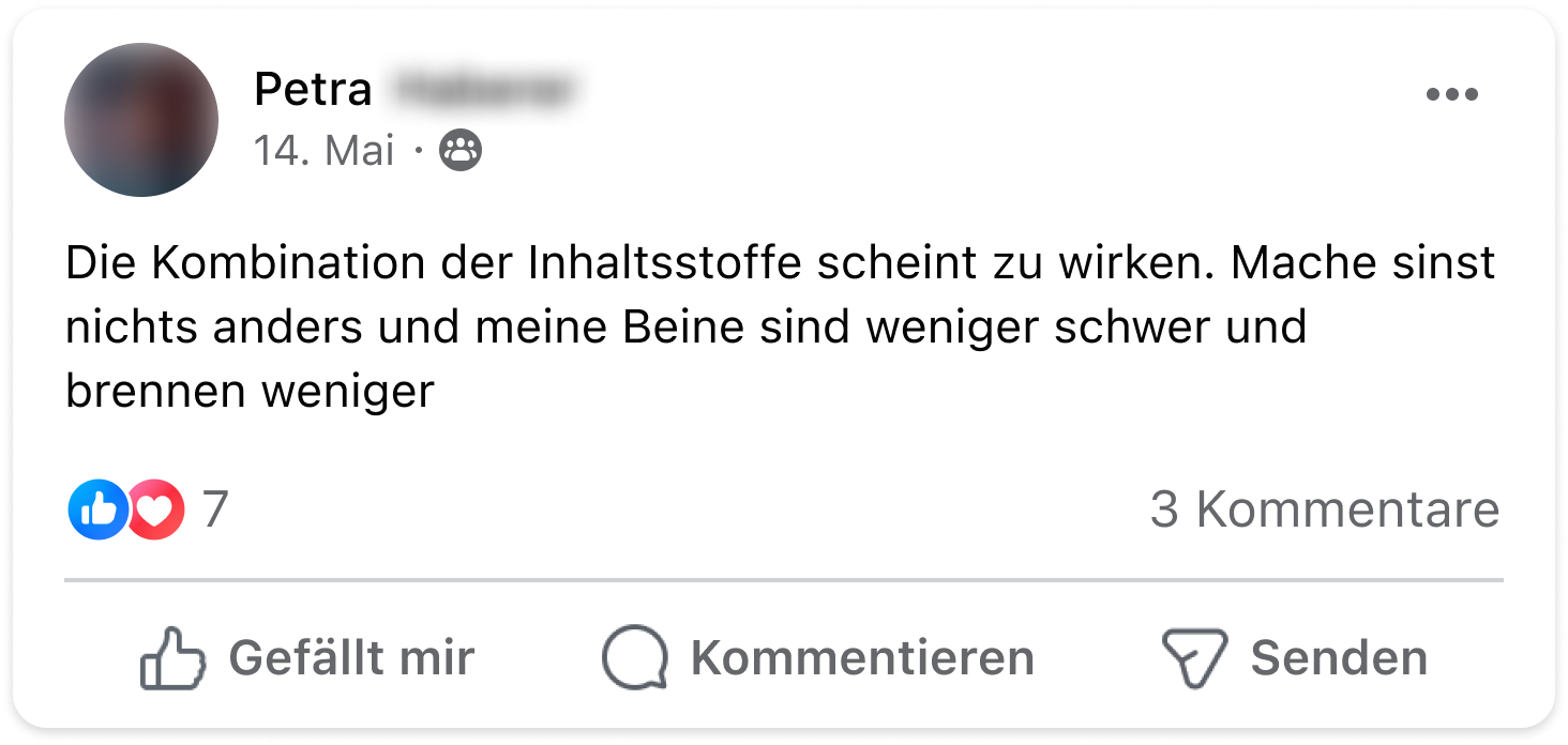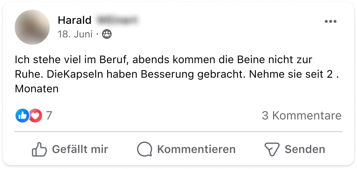 Ich habe seit vielen Jahren unter massivem Restless-Legs-Syndrom gelitten. Jede Nacht wurden meine Beine unruhig – mal links, mal rechts, völlig unvorhersehbar. Das war für mich eine Art Folter und an erholsamen Schlaf war nicht zu denken. Durch Zufall stieß ich auf den Ruhe-Komplex. Schon nach kurzer Zeit merkte ich den Unterschied. Meine Beine wurden ruhig und ich konnte endlich wieder durchschlafen. Seitdem nehme ich den Ruhe-Komplex täglich und meine Beschwerden sind verschwunden – ganz ohne die Risiken der Medikamente. Für mich ist das eine echte Befreiung