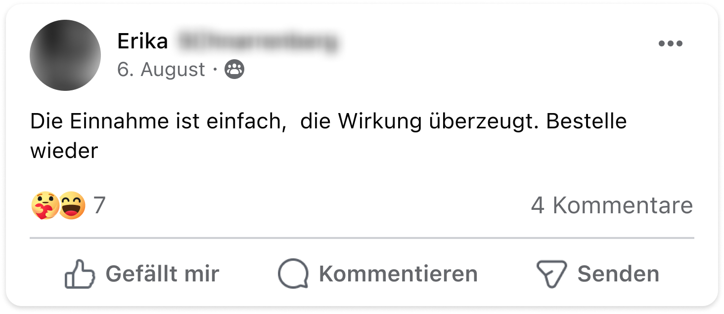 Disclaimer: Dieses Produkt ist nicht zur Diagnose, Behandlung, Heilung von oder zur Vorbeuge vor Krankheiten bestimmt. Die Ergebnisse können variieren / sind eventuell nicht typisch. Bewertungen oder Testimonials sind individuelle Erfahrungsberichte unserer Kunden. Diese Informationen stellen keine medizinische Beratung dar und dürfen auch nicht als eine solche verstanden werden. Sprich bitte mit deinem Arzt, bevor du dein regelmäßiges, ärztlich vorgeschriebenes Behandlungsverfahren änderst. Nahrungsergänzungsmittel sind kein Ersatz für eine ausgewogene und abwechslungsreiche Ernährung und eine gesunde Lebensweise. Das Bildmaterial unserer Kundenfeedbacks wurde aus Gründen des Persönlichkeitsrechts z.T. lizensiert erworben und entspricht nicht immer dem echten Erscheinungsbild.