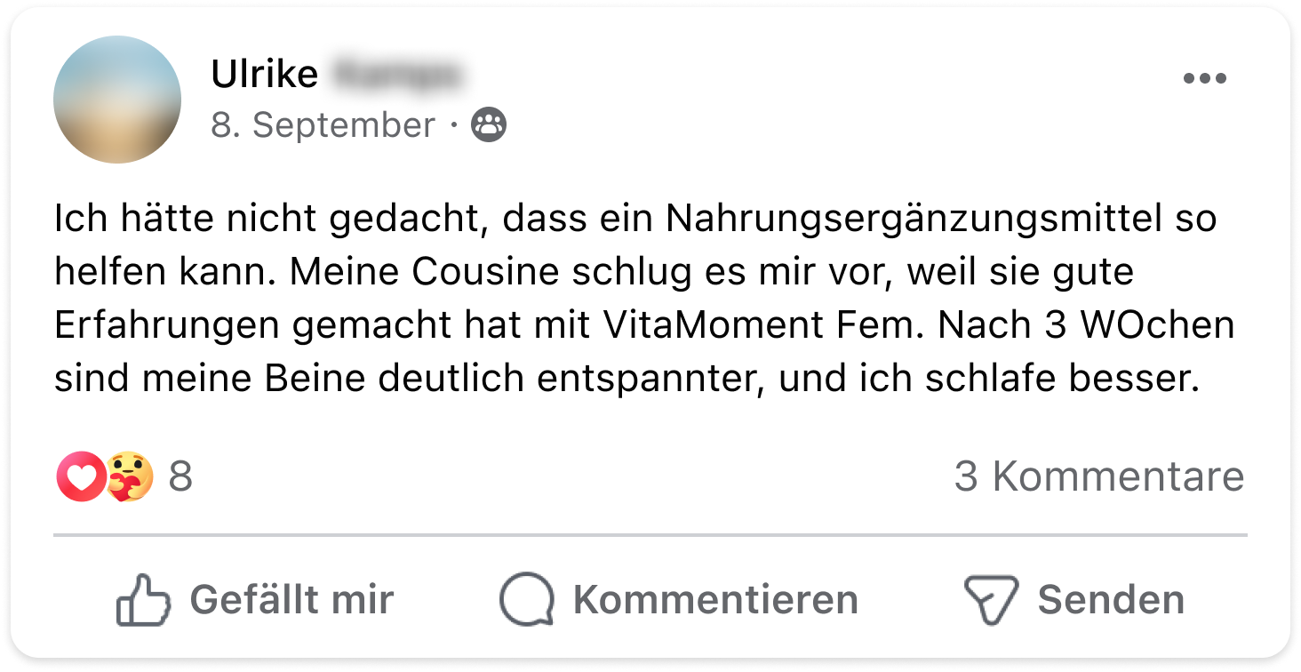 Jahrelang waren unruhige Beine mein ständiger Begleiter – jede Nacht dieses Kribbeln, Zucken und die Angst, wieder nicht schlafen zu können. Tagsüber war ich müde und gereizt. Mit dem Ruhe-Komplex hat sich das komplett verändert: Meine Beine sind entspannt, auch abends, und ich wache ausgeruht auf. Danke, VitaMoment!