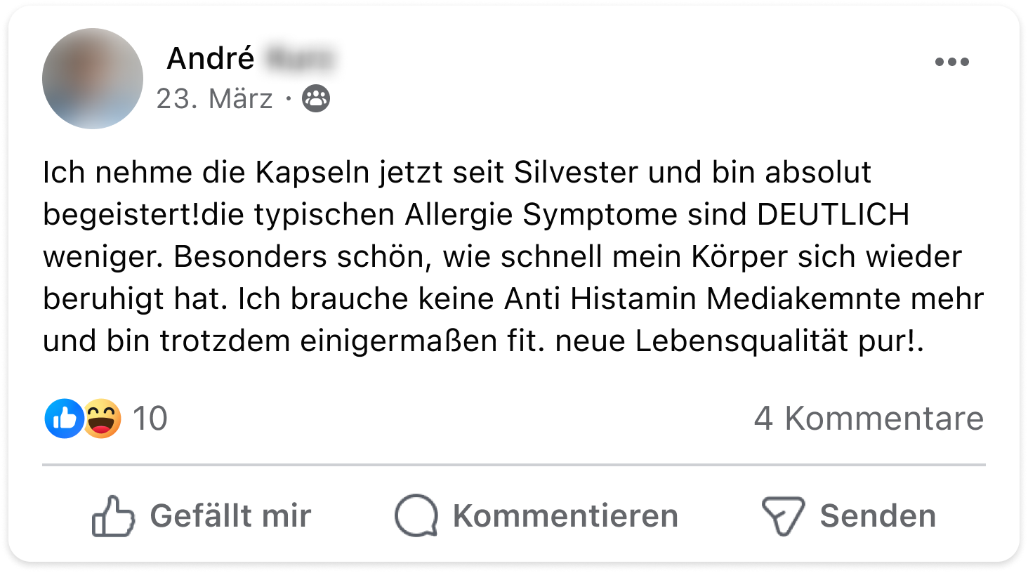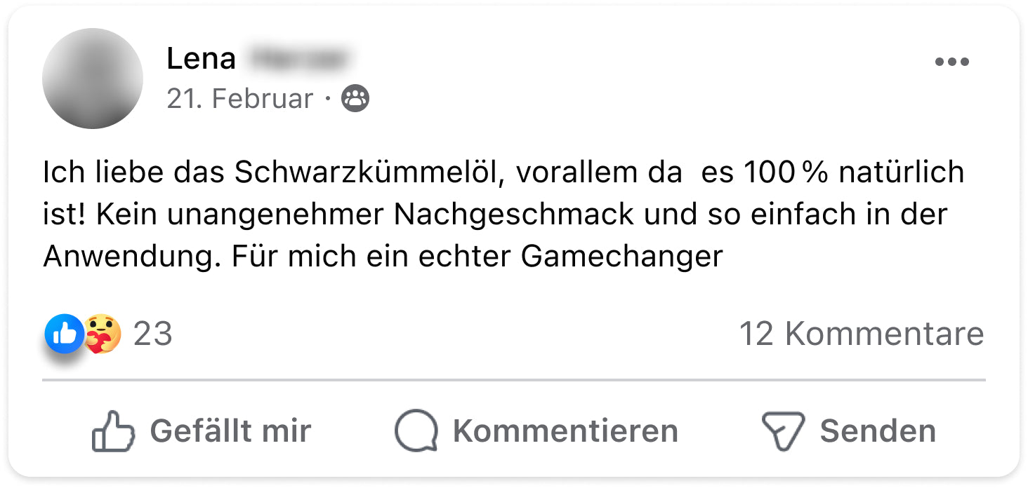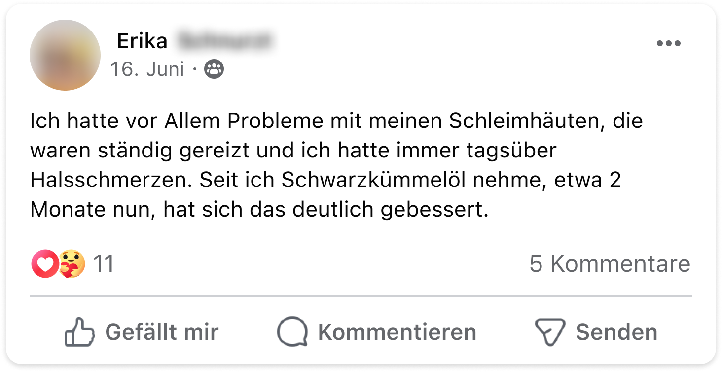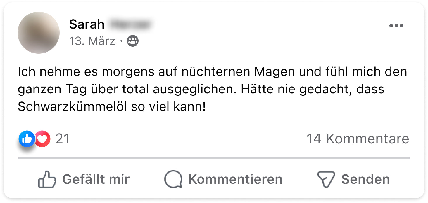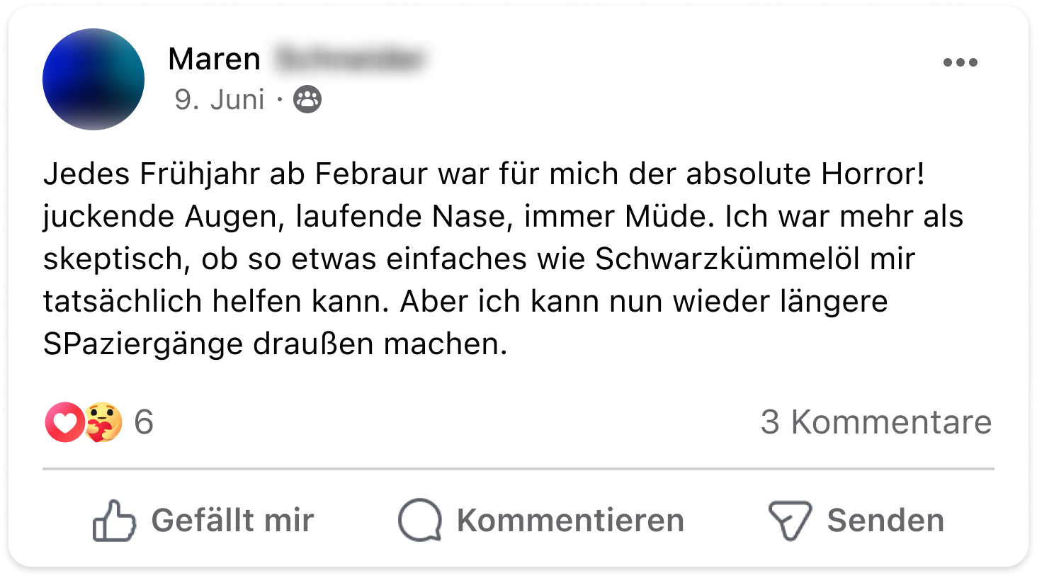 Allergien begleiten mich seit der Kindheit, und ich habe schon alles ausprobiert. Schwarzkümmelöl war für mich ein letzter Versuch, bevor ich wieder starke Medikamente nehme. Es wirkt zwar langsam, aber es wirkt. Und das tut es sehr nachhaltig! Seit einigen Wochen brauche ich kaum mehr andere Tabletten. Ich wünschte, ich hätte das früher entdeckt.