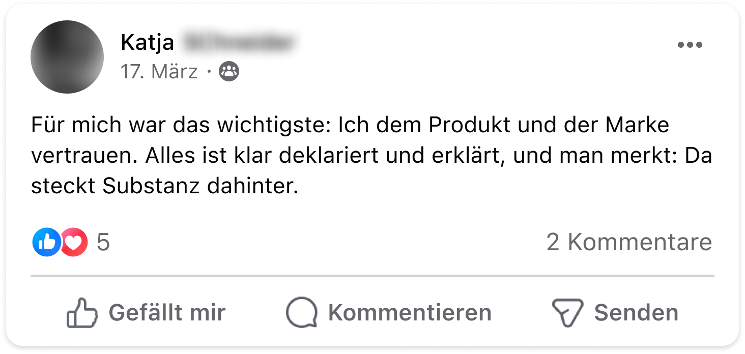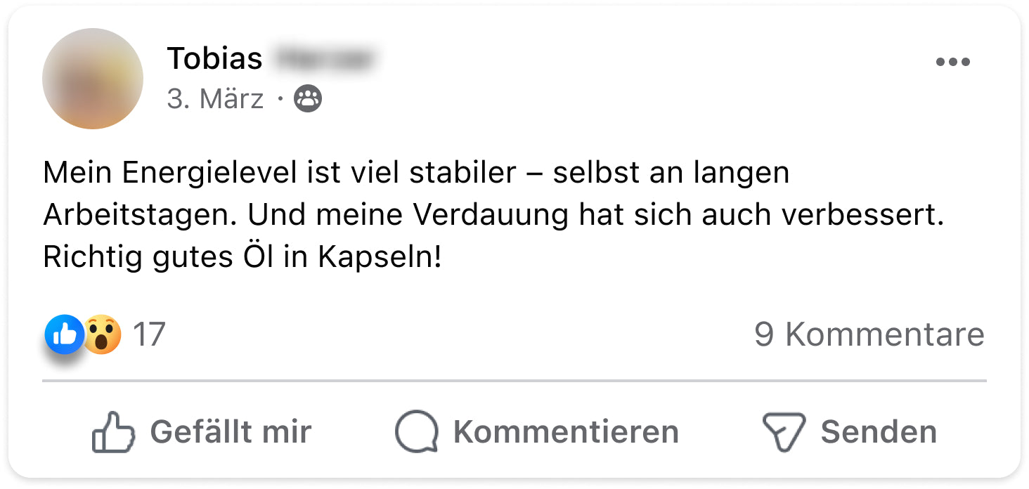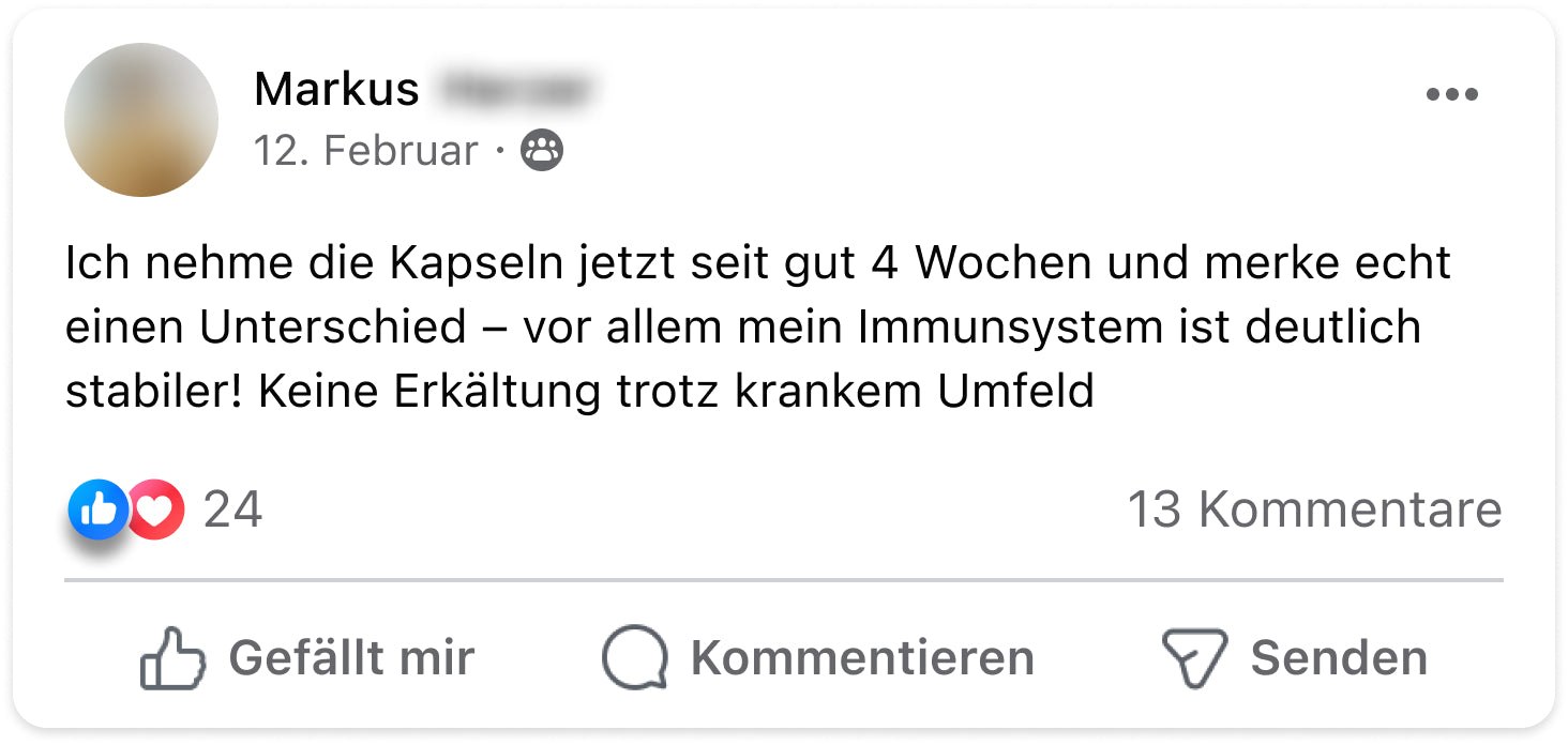 Disclaimer: Dieses Produkt ist nicht zur Diagnose, Behandlung, Heilung von oder zur Vorbeuge vor Krankheiten bestimmt. Die Ergebnisse können variieren / sind eventuell nicht typisch. Bewertungen oder Testimonials sind individuelle Erfahrungsberichte unserer Kunden. Diese Informationen stellen keine medizinische Beratung dar und dürfen auch nicht als eine solche verstanden werden. Sprich bitte mit deinem Arzt, bevor du dein regelmäßiges, ärztlich vorgeschriebenes Behandlungsverfahren änderst. Nahrungsergänzungsmittel sind kein Ersatz für eine ausgewogene und abwechslungsreiche Ernährung und eine gesunde Lebensweise. Das Bildmaterial unserer Kundenfeedbacks wurde aus Gründen des Persönlichkeitsrechts z.T. lizensiert erworben und entspricht nicht immer dem echten Erscheinungsbild.