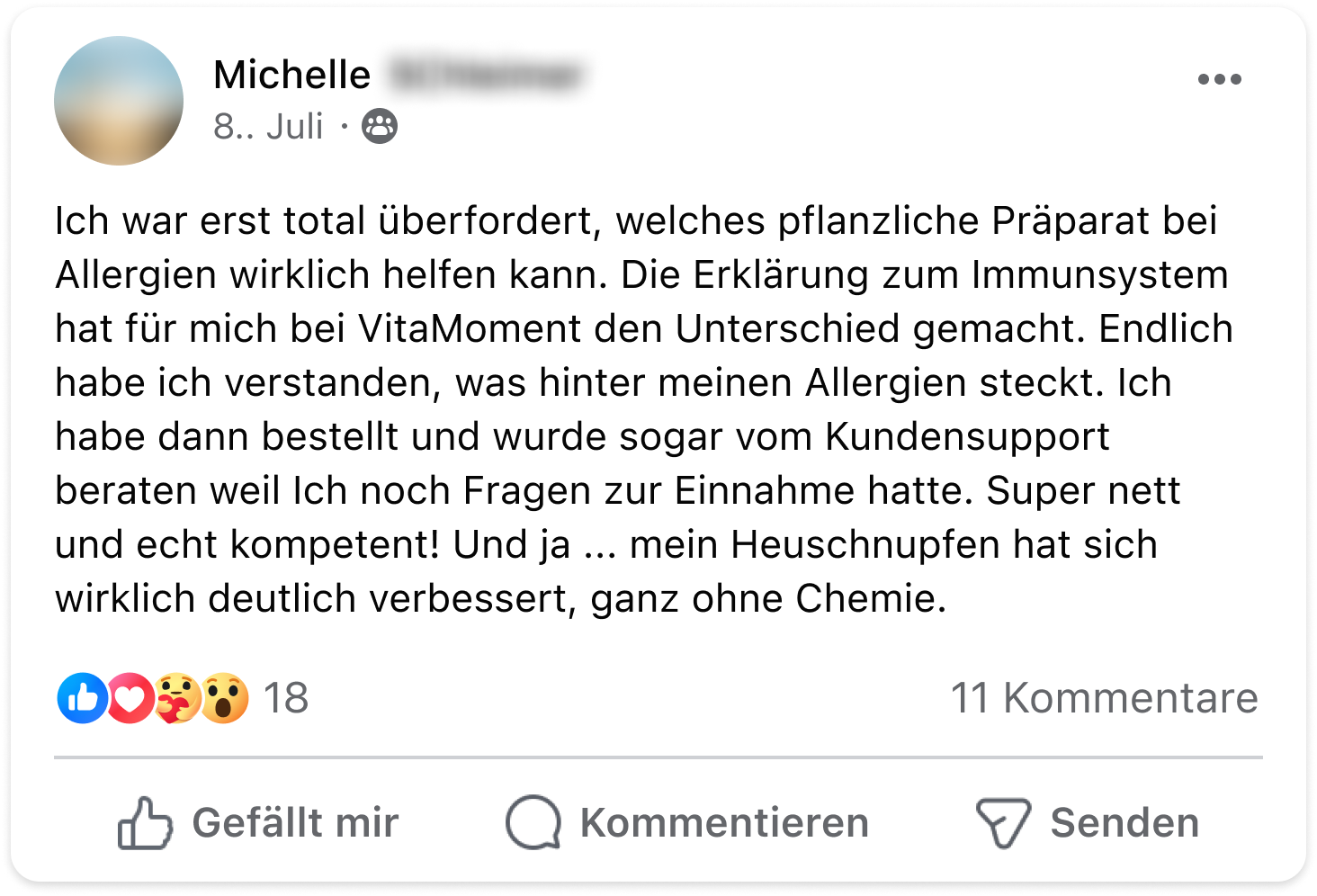 Durch einen Podcast bin ich eher zufällig auf VitaMoment gestoßen – und bin heute richtig froh darüber. Die Inhalte haben mir geholfen, Produkte und Inhaltsstoffe besser zu verstehen und bewusstere Entscheidungen zu treffen. Seitdem achte ich mehr auf Qualität – und bin mittlerweile echter VitaMoment-Fan!