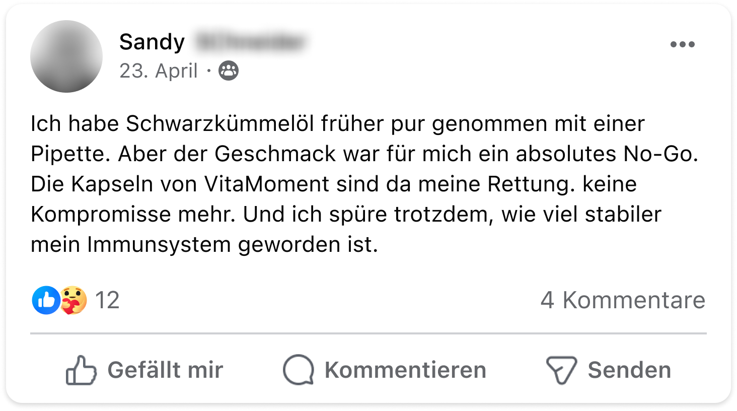Die Schwarzkümmelöl-Kapseln von VitaMoment helfen dir dabei, allergische Beschwerden natürlich zu lindern und dein Immunsystem langfristig von innen heraus zu regulieren.