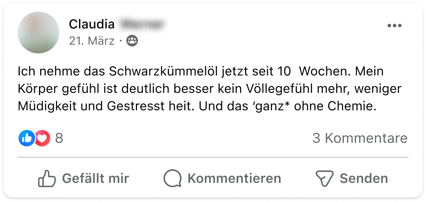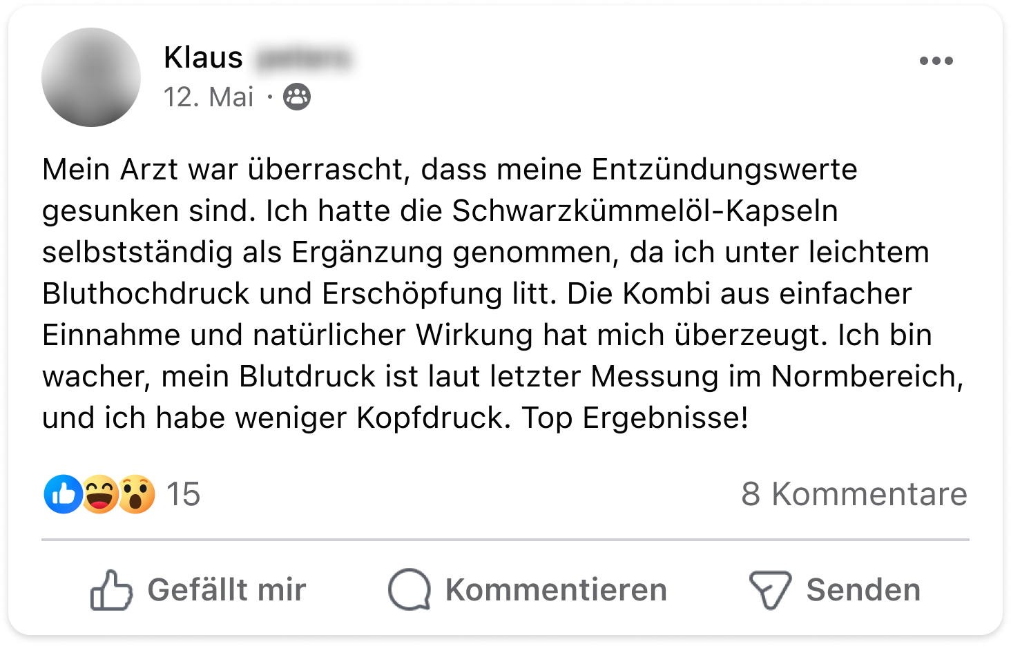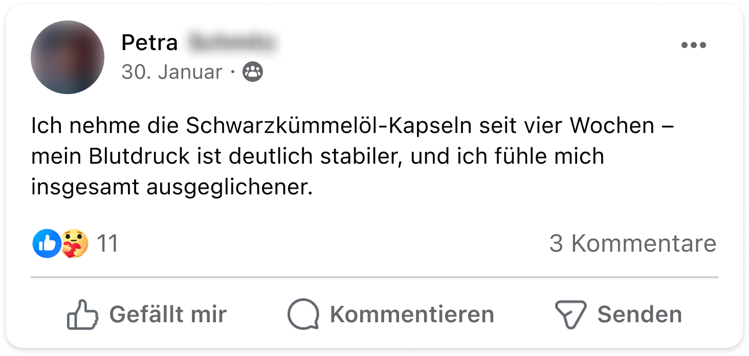 Ich hatte jahrelang leicht erhöhten Blutdruck und sollte letztendlich Blutdrucksenker nehmen. Die haben mich extrem müde gemacht. Zuerst habe ich die Schwarzkümmelöl-Kapseln ergänzend genommen und es ging mir viel besser mit ihnen. Irgendwann habe ich einfach mal probiert, die Medikamente sein zu lassen. Seit 5 Monaten nehme ich nur die Schwarzkümmel-Kapseln und es geht mir blendend.