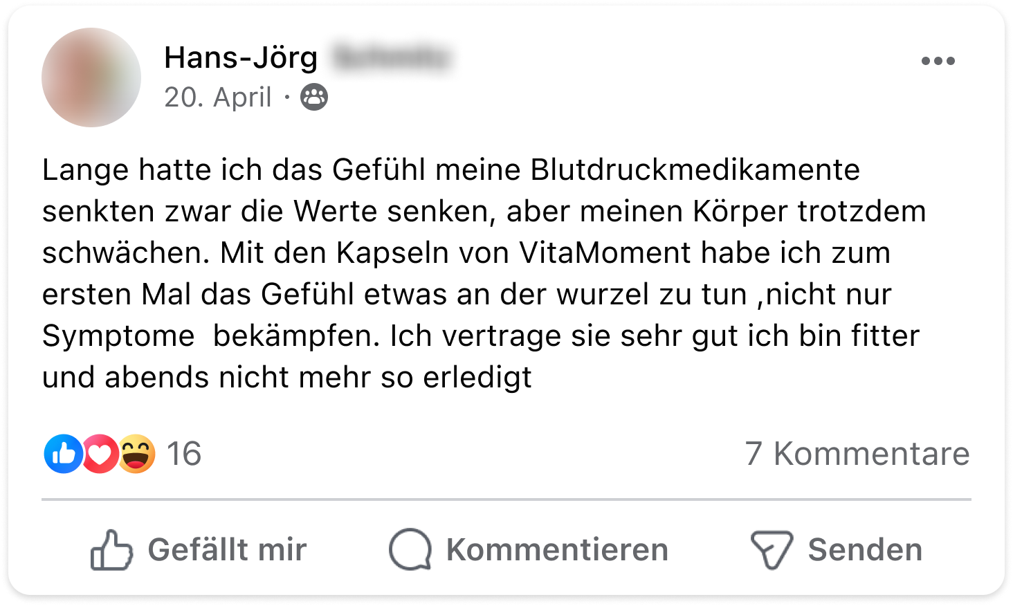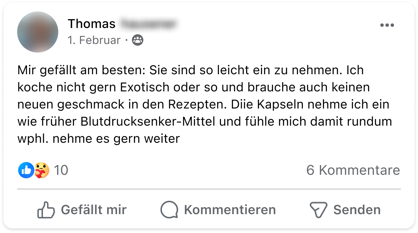 Ich war skeptisch, aber auch neugierig. Nach rund sechs Wochen spüre ich, dass mein Kreislauf stabiler ist, besonders morgens. Früher war ich schnell aus der Puste. Das hat sich verändert. Ich hoffe, mein Blutdruck bleibt so konstant. Die Kapseln sind einfach einzunehmen und belasten den Magen nicht. Ich werde sie definitiv weiternehmen.