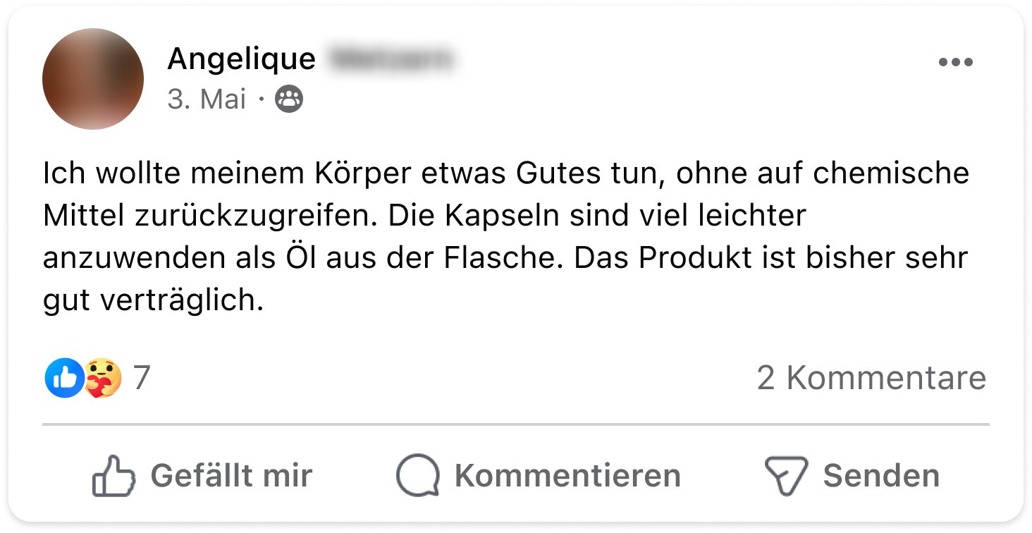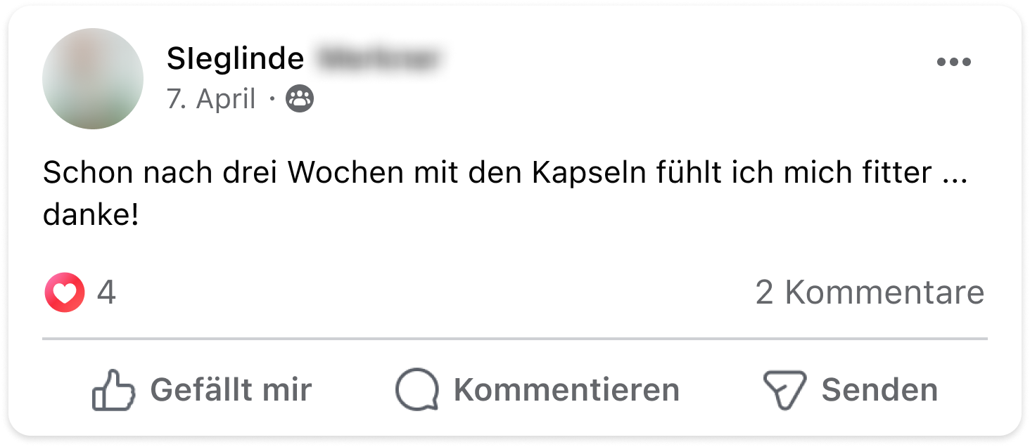 Disclaimer: Dieses Produkt ist nicht zur Diagnose, Behandlung, Heilung von oder zur Vorbeuge vor Krankheiten bestimmt. Die Ergebnisse können variieren / sind eventuell nicht typisch. Bewertungen oder Testimonials sind individuelle Erfahrungsberichte unserer Kunden. Diese Informationen stellen keine medizinische Beratung dar und dürfen auch nicht als eine solche verstanden werden. Sprich bitte mit deinem Arzt, bevor du dein regelmäßiges, ärztlich vorgeschriebenes Behandlungsverfahren änderst. Nahrungsergänzungsmittel sind kein Ersatz für eine ausgewogene und abwechslungsreiche Ernährung und eine gesunde Lebensweise. Das Bildmaterial unserer Kundenfeedbacks wurde aus Gründen des Persönlichkeitsrechts z.T. lizensiert erworben und entspricht nicht immer dem echten Erscheinungsbild.