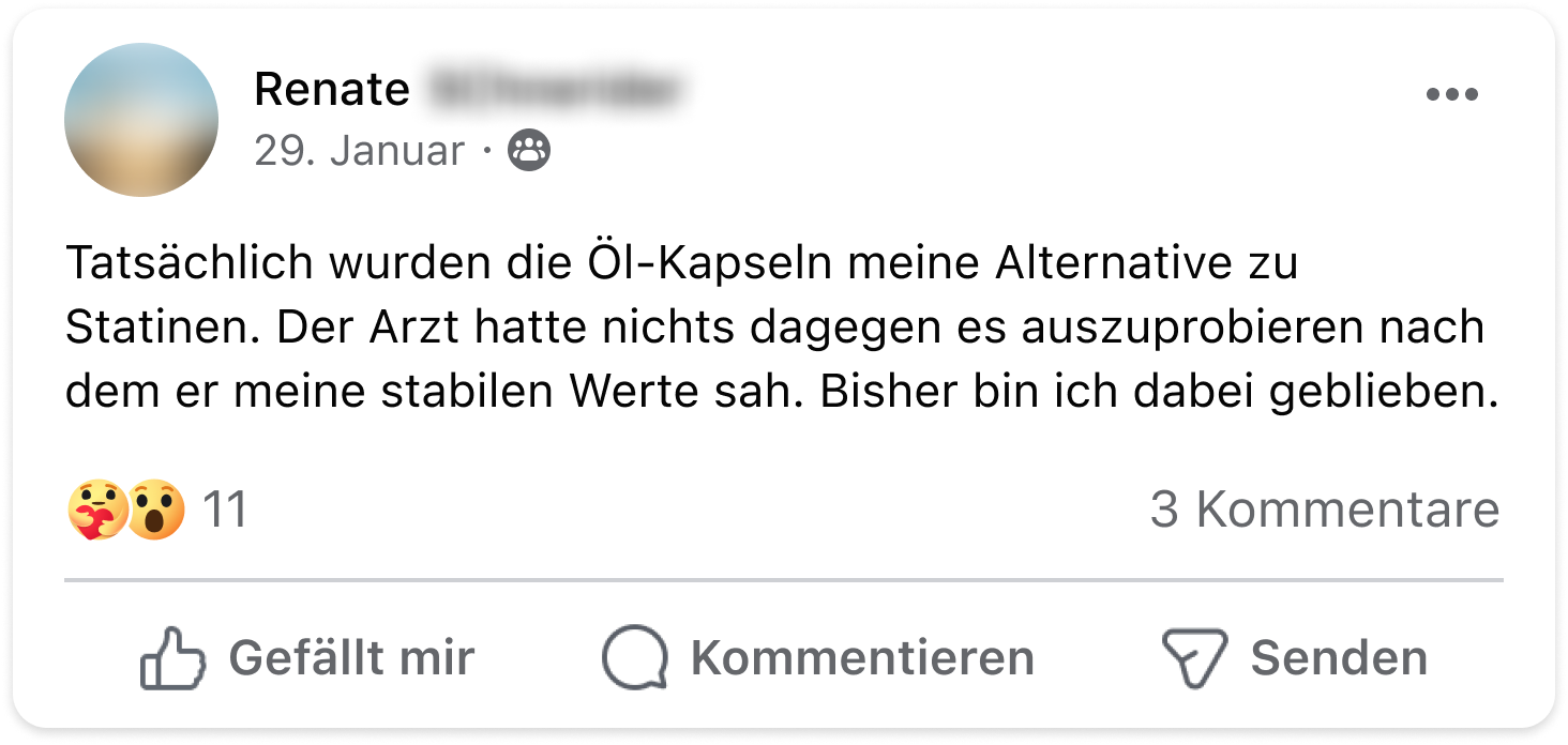 Ich fiel wie aus allen Wolken, als mir mein Arzt erhöhte Blutfettwerte diagnostizierte. Auf keinen Fall wollte ich Medikamente nehmen, zumindest nicht, solange etwas anderes möglich war. Mit dem Schwarzkümmelöl von VitaMoment haben sich meine Werte dauerhaft stabilisiert. Selbst mein Arzt staunte nicht schlecht. Ich bin einfach nur sehr erleichtert.