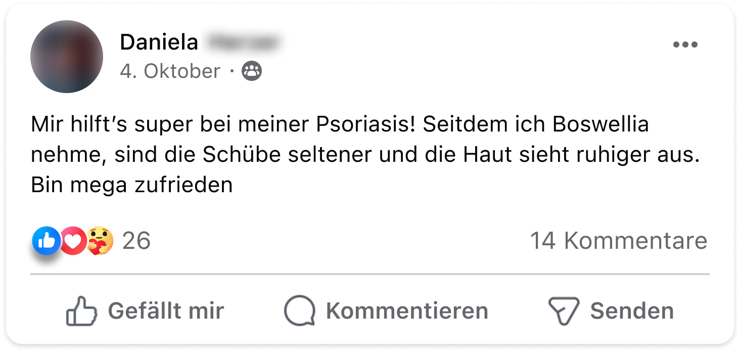 Meine Haut ist deutlich ruhiger geworden. Ich leide schon seit frühester Kindheit an Schuppenflechte und hatte besonders in den letzten Jahren immer heftigere Schübe, vor allem in stressigen Phasen. Seit ich die Boswellia-Kapseln nehme, ist meine Haut viel weniger gereizt. Die Rötungen sind zurückgegangen und ich habe das Gefühl, dass mein Körper insgesamt besser ins Gleichgewicht kommt. Für mich ein echter Gamechanger!