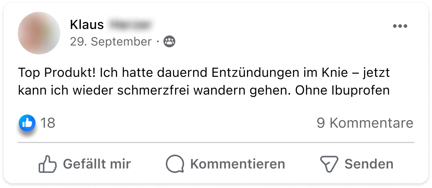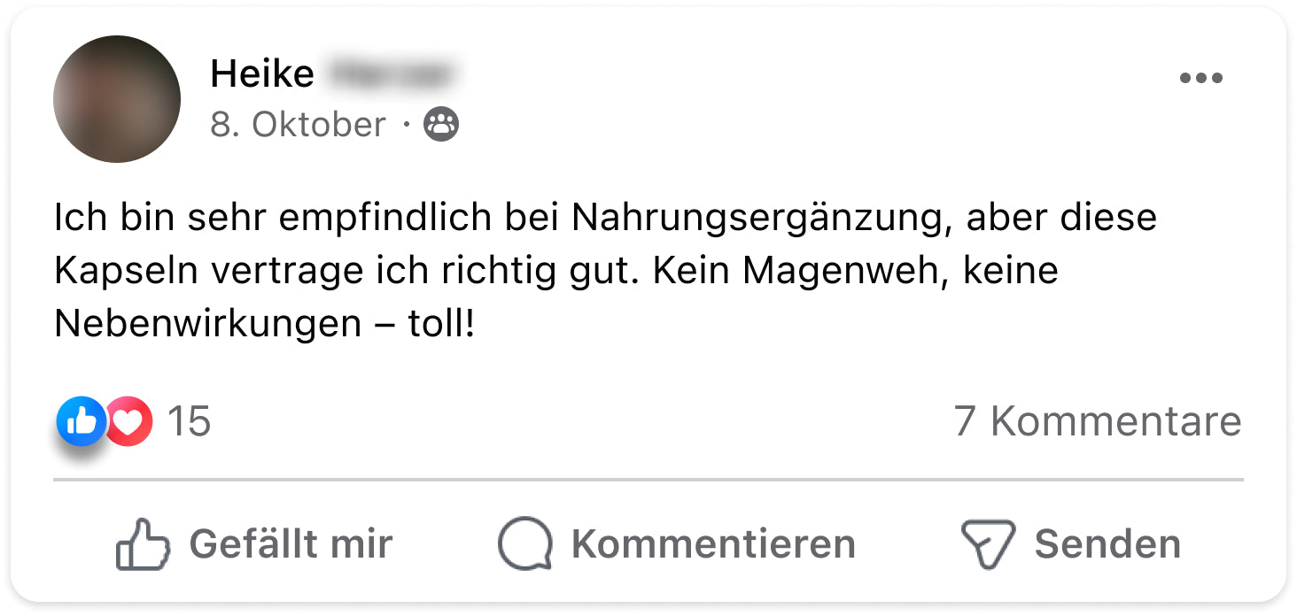 Disclaimer: Dieses Produkt ist nicht zur Diagnose, Behandlung, Heilung von oder zur Vorbeuge vor Krankheiten bestimmt. Die Ergebnisse können variieren / sind eventuell nicht typisch. Bewertungen oder Testimonials sind individuelle Erfahrungsberichte unserer Kunden. Diese Informationen stellen keine medizinische Beratung dar und dürfen auch nicht als eine solche verstanden werden. Sprich bitte mit deinem Arzt, bevor du dein regelmäßiges, ärztlich vorgeschriebenes Behandlungsverfahren änderst. Nahrungsergänzungsmittel sind kein Ersatz für eine ausgewogene und abwechslungsreiche Ernährung und eine gesunde Lebensweise. Das Bildmaterial unserer Kundenfeedbacks wurde aus Gründen des Persönlichkeitsrechts z.T. lizensiert erworben und entspricht nicht immer dem echten Erscheinungsbild.