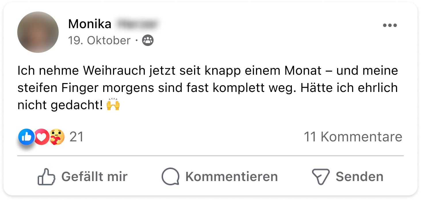 Endlich stehe ich morgens wieder ohne Steifheit auf! Ich nehme die Weihrauch-Kapseln jetzt seit knapp 5 Wochen – und ich kann es kaum glauben: Meine morgendliche Gelenksteife in den Knien ist fast komplett verschwunden. Ich hatte schon einiges ausprobiert, aber nichts hat so sanft und gleichzeitig effektiv geholfen. Ich fühle mich beweglicher und belastbarer im Alltag. Absolute Empfehlung!