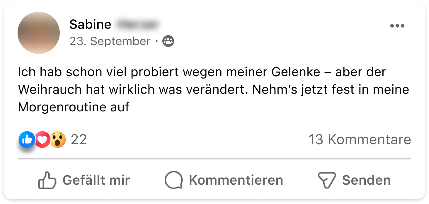 Weihrauch ist bekannt für seine entzündungshemmenden und regenerierenden Eigenschaften. Er hilft deinem Körper, in Balance zu bleiben, unterstützt die natürliche Beweglichkeit und fördert ein Gefühl von innerer Ruhe und neuer Vitalität.