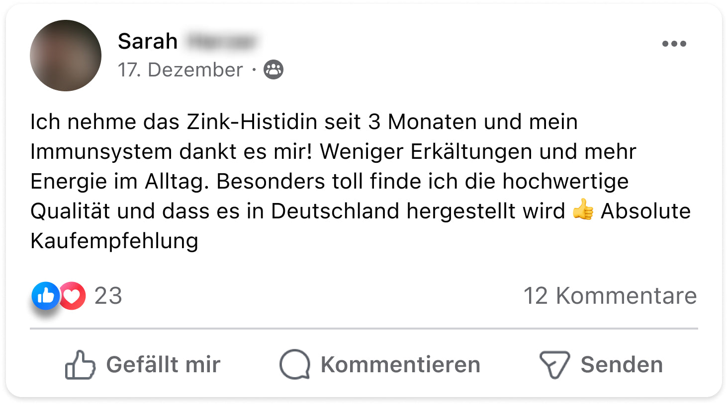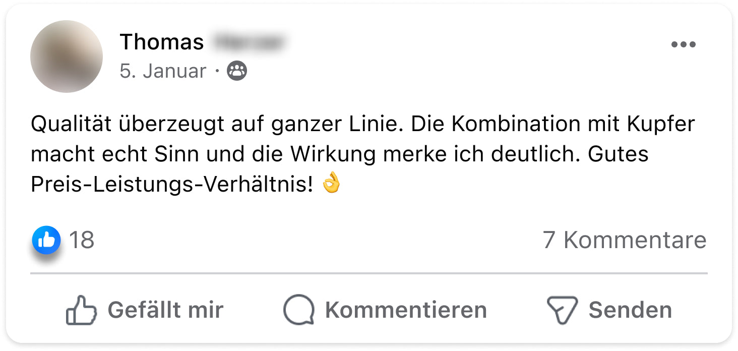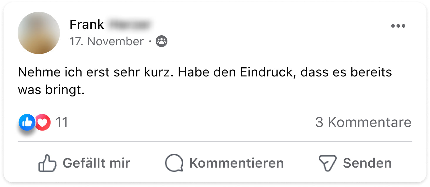 Disclaimer: Dieses Produkt ist nicht zur Diagnose, Behandlung, Heilung von oder zur Vorbeuge vor Krankheiten bestimmt. Die Ergebnisse können variieren / sind eventuell nicht typisch. Bewertungen oder Testimonials sind individuelle Erfahrungsberichte unserer Kunden. Diese Informationen stellen keine medizinische Beratung dar und dürfen auch nicht als eine solche verstanden werden. Sprich bitte mit deinem Arzt, bevor du dein regelmäßiges, ärztlich vorgeschriebenes Behandlungsverfahren änderst. Nahrungsergänzungsmittel sind kein Ersatz für eine ausgewogene und abwechslungsreiche Ernährung und eine gesunde Lebensweise. Das Bildmaterial unserer Kundenfeedbacks wurde aus Gründen des Persönlichkeitsrechts z.T. lizensiert erworben und entspricht nicht immer dem echten Erscheinungsbild.