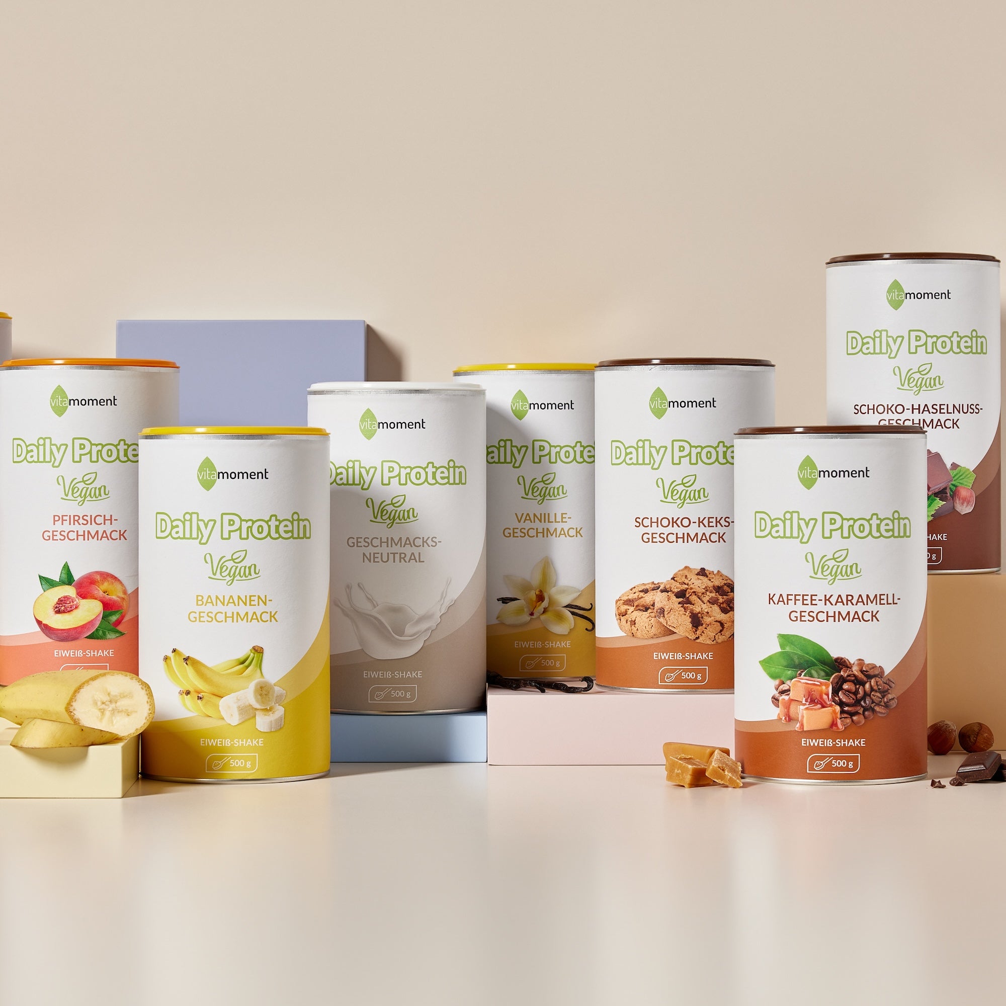 Der Daily Protein Shake Vegan kommt ganz ohne tierische Inhaltsstoffe aus und liefert hochwertiges pflanzliches Eiweiß bei cremigem Milchshake-Geschmack. Dank der zucker- und fettarmen Rezeptur ist er figurfreundlich und ideal für eine proteinreiche Ernährung im Alltag. Die innovative Kombination aus Ackerbohnen-, Erbsen- und Kürbiskernprotein sorgt für ein vollständiges Aminosäurenprofil und eine hohe biologische Wertigkeit. Zudem überzeugt der Shake durch seinen mild-nussigen Geschmack und seine gute Löslichkeit. Ob im Müsli, im Joghurt oder als schneller Shake zwischendurch – er ist ein vielseitiger und leckerer Proteinlieferant für jeden Tag.